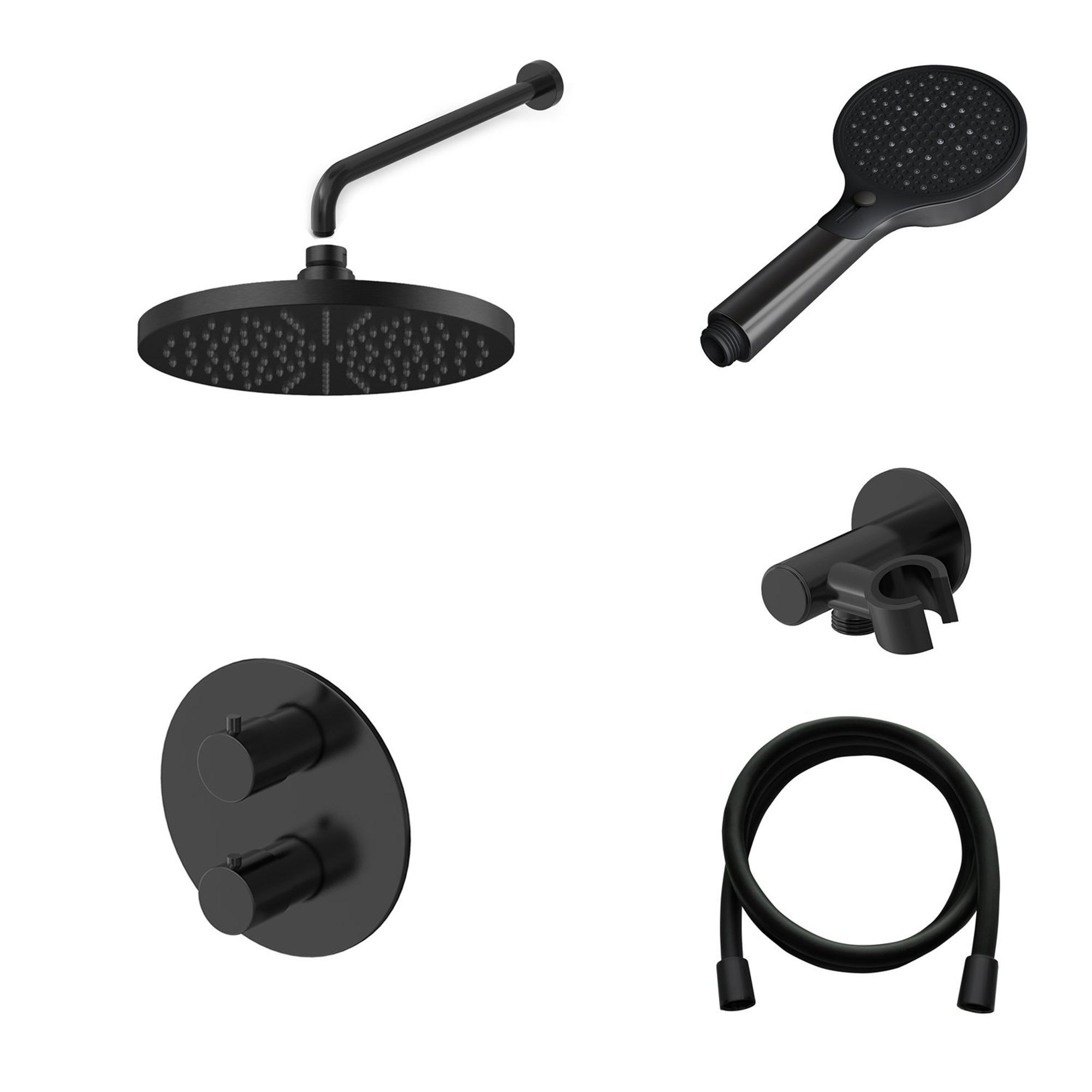 Hotbath COBBER Ensemble de douche à effet pluie - robinet encastré - thermostatique - pomme de douche 20 cm - douchette à main - noir mat PVD