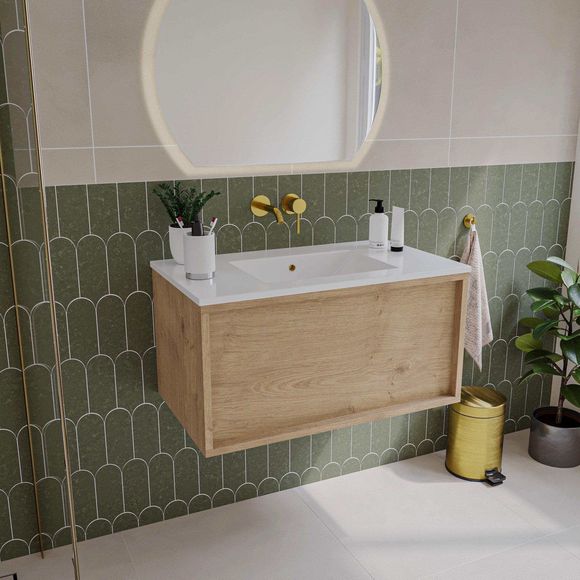Ce meuble de salle de bains est un exemple de savoir-faire élégant. Le chêne naturel avec une belle texture plate offre une apparence chaleureuse et accueillante qui s'adapte parfaitement aux salles de bains modernes comme classiques. Le tiroir sans poignée assure un look épuré et minimaliste sans compromettre la facilité d'utilisation. L'absence de trous de robinet conserve un aspect calme et ordonné, tout en vous laissant la liberté de choisir un robinet qui correspond à votre style. Vous créez ainsi une salle de bains non seulement fonctionnelle, mais aussi agréable à regarder.