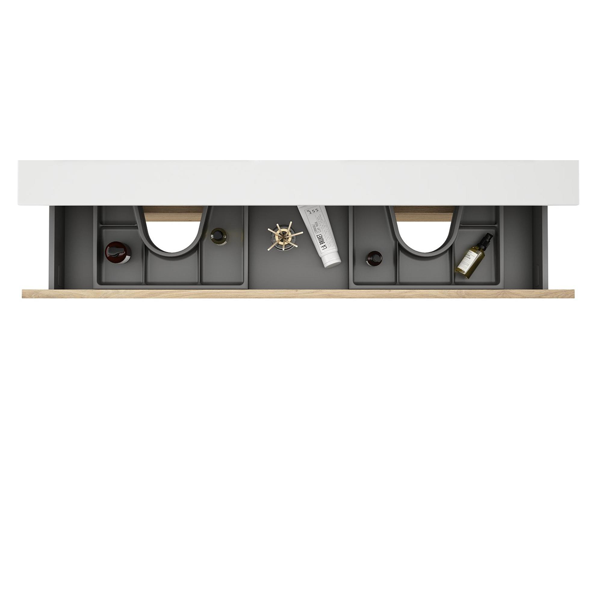 Avec deux grands tiroirs, cet ensemble offre beaucoup d’espace de rangement pour garder votre salle de bains propre et organisée. Le design sans poignée assure un look épuré et rend l’ouverture et la fermeture des tiroirs fluides et silencieuses. Le plan de toilette inclus est non seulement élégant, mais aussi pratique : il est facile à nettoyer et offre suffisamment d’espace pour vos produits de soin quotidiens. Vous profitez ainsi d’une expérience de salle de bains ordonnée et confortable.