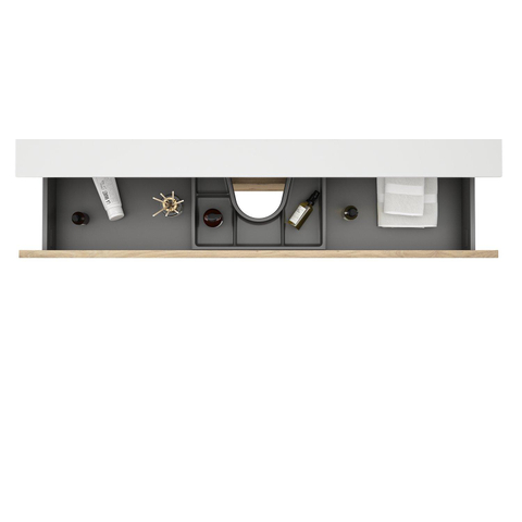 Avec deux tiroirs spacieux, vous disposez de beaucoup d’espace pour ranger proprement tous vos accessoires de salle de bains. Les tiroirs sans poignée s’ouvrent en douceur et se ferment silencieusement, contribuant à une ambiance calme et ordonnée. La vasque avec un trou de robinet et un trop-plein est concue pour un usage optimal et sécurisé, vous permettant de profiter sereinement de votre routine quotidienne. Ce meuble combine avantages pratiques et design épuré, répondant parfaitement à vos attentes.