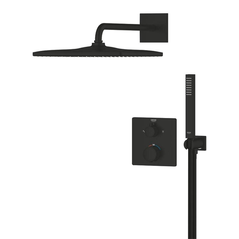 Grohe Precision Mitigeur thermostatique Ensemble de douche Perfect - douche de tête carrée - douchette à main stick - y compris coude de raccord mural - noir mat