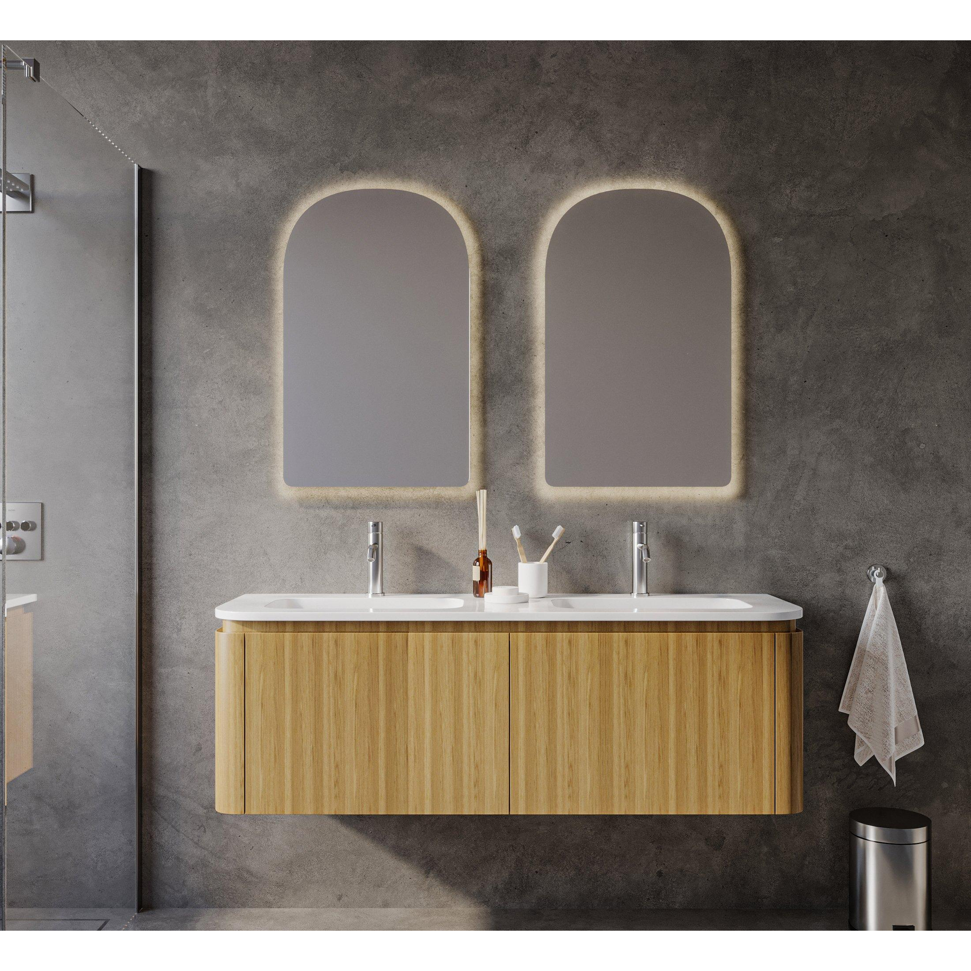 Saniclass Terra Ensemble meuble de salle de bains - 140cm - 4 tiroirs - coins arrondis - 2 vasques - 2 trous de robinet - sandwood (chêne clair)