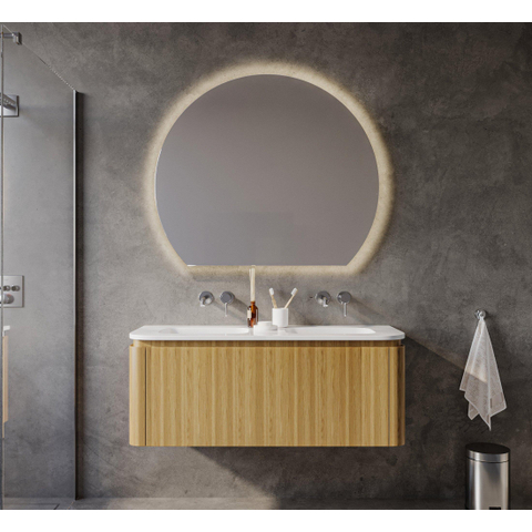 La finition sandwood en chêne clair confère au meuble une apparence chaleureuse et naturelle, à la fois moderne et intemporelle. Les coins arrondis apportent une forme douce et accueillante qui adoucit le design épuré. Cela rend le meuble adapté à divers styles de salle de bains, du scandinave au classique. Les tons clairs du bois créent une ambiance fraîche et lumineuse, donnant à votre salle de bains une impression d'espace et de sérénité. Grâce aux détails subtils et à la finition de haute qualité, le meuble est non seulement élégant, mais aussi très naturel et chaleureux, contribuant à une expérience agréable dans la salle de bains.