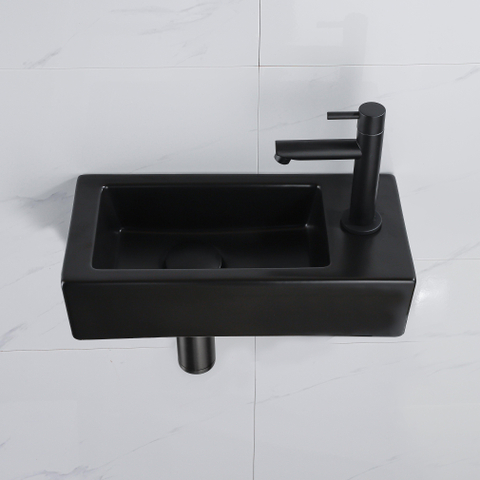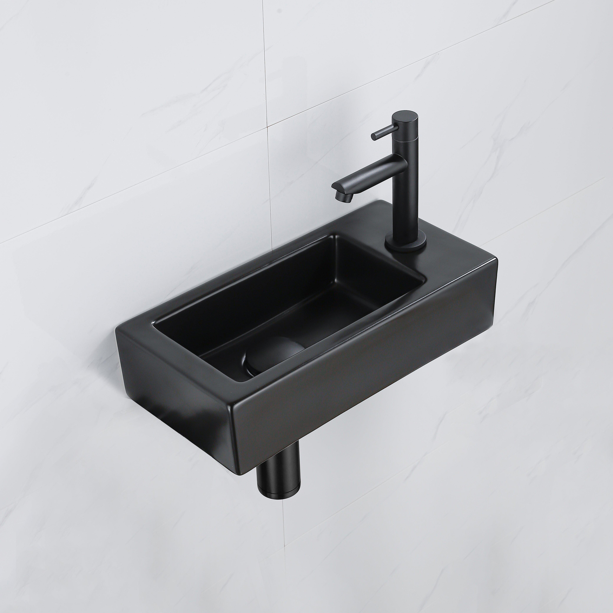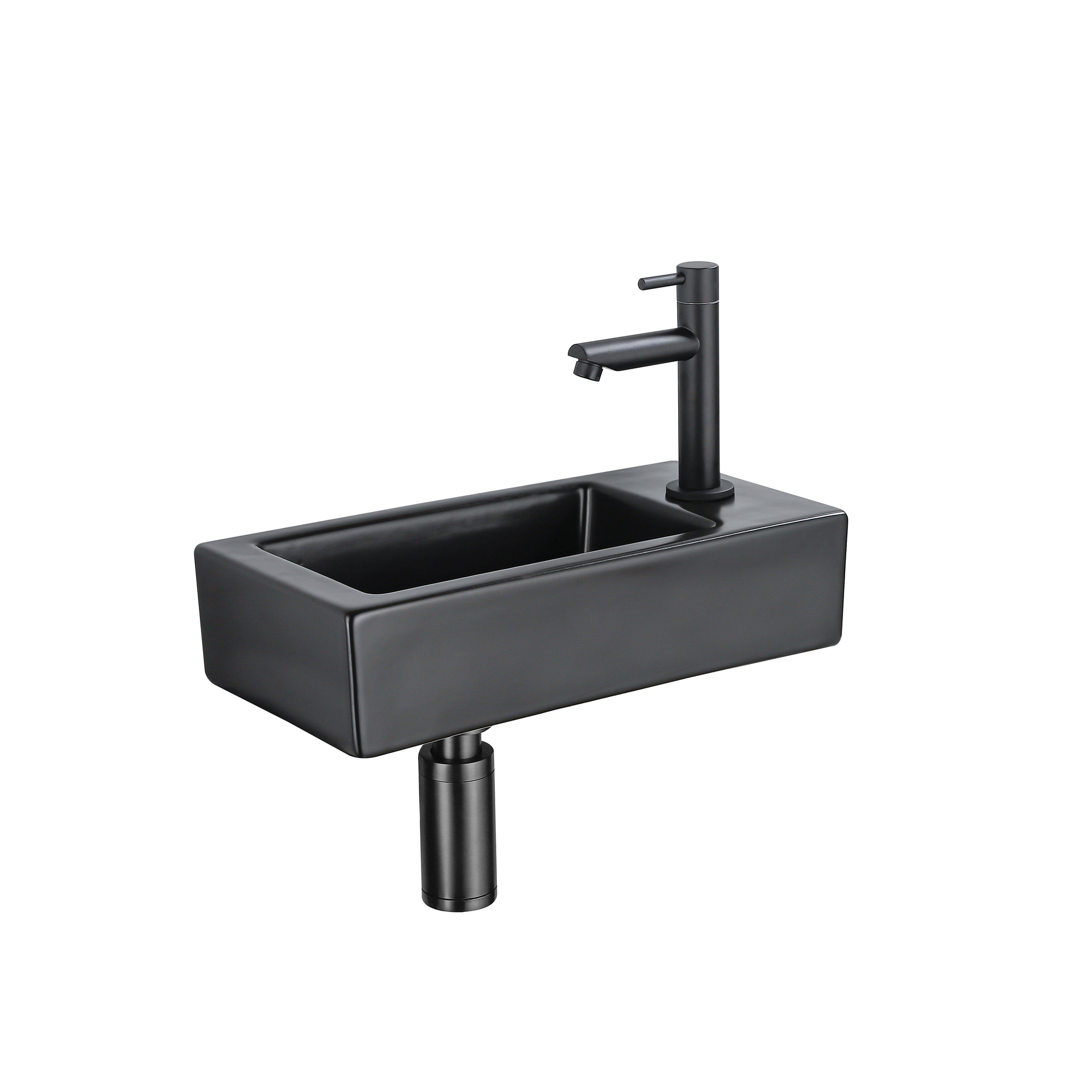 FugaFlow Efficiente Pietra Ensemble lave-mains - 37.5x18.5x9 cm - céramique - trou de robinet à droite - robinet de lave-mains noir mat - bonde de vidage - siphon extra-plat - noir mat