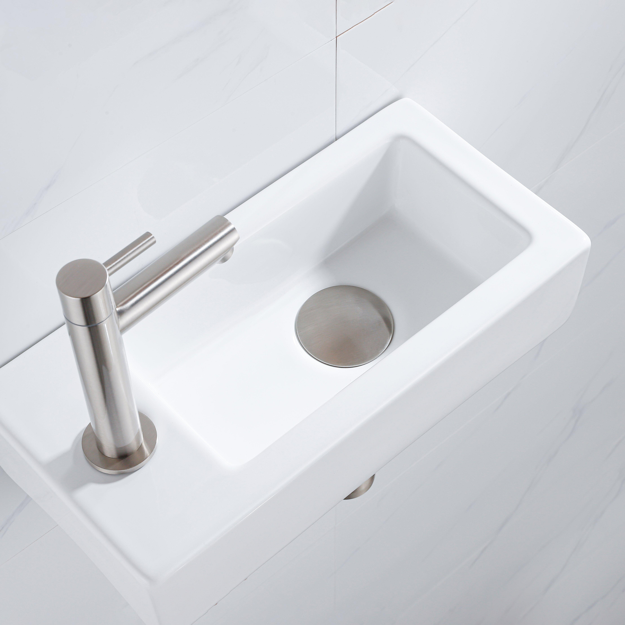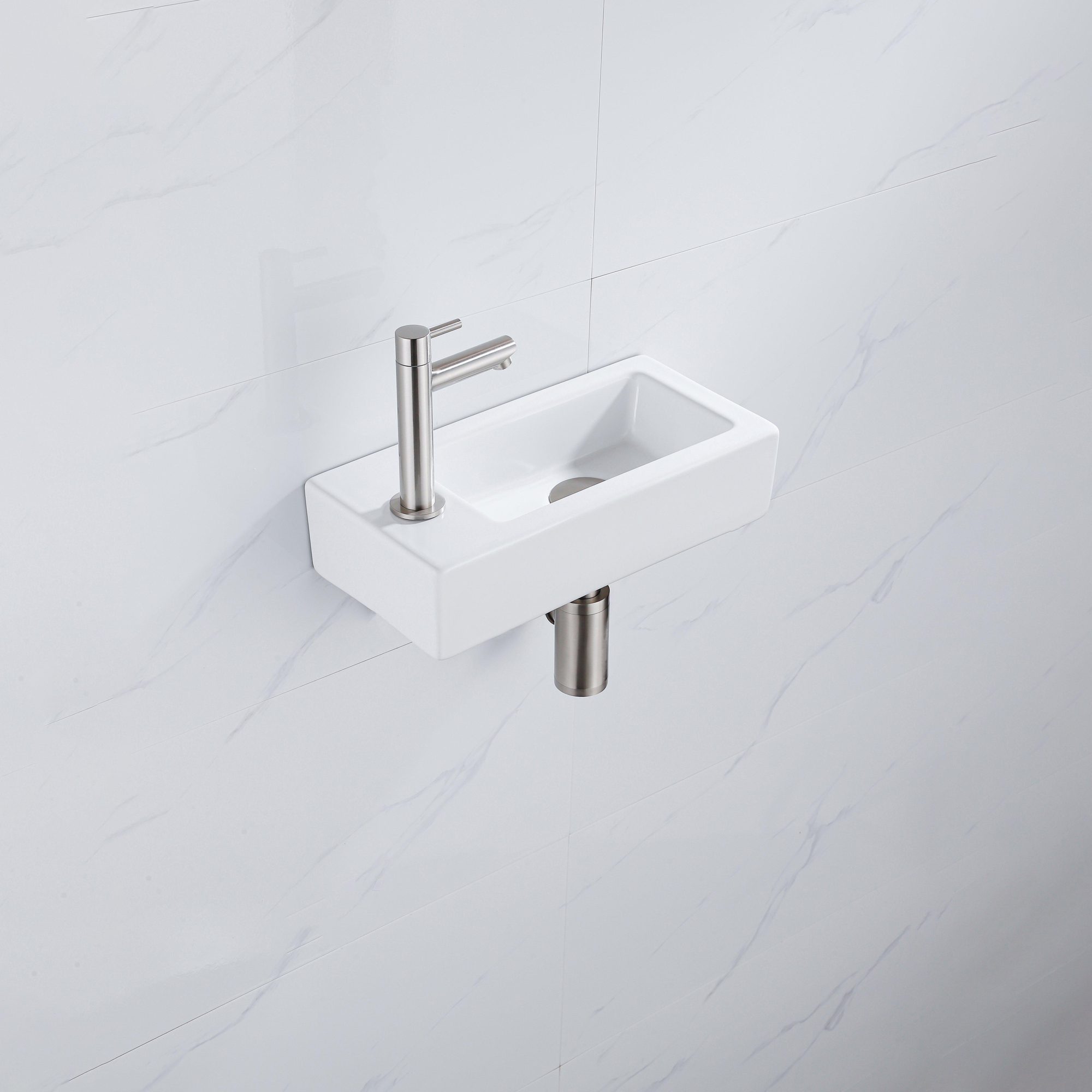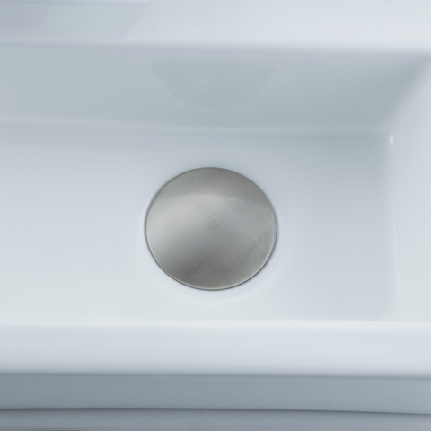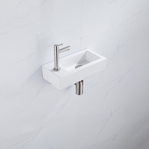 Le QeramiQ Fuente Kit lave-mains dégage élégance et style avec sa céramique blanche brillante et son robinet lave-mains en inox brossé. Le trou de robinet à gauche permet une disposition pratique et fonctionnelle, tandis que la bonde de vidage et le siphon abaissé assurent une finition sans joint.