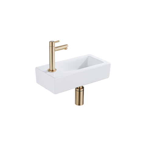 Le QeramiQ Fuente Kit lave-mains dégage style et élégance avec sa finition blanche brillante et ses lignes épurées. Le matériau céramique assure durabilité et une apparence luxueuse dans chaque salle de bain. Le trou de robinet à gauche et le robinet lave-mains en laiton brossé ajoutent une touche de modernité à ce design intemporel.