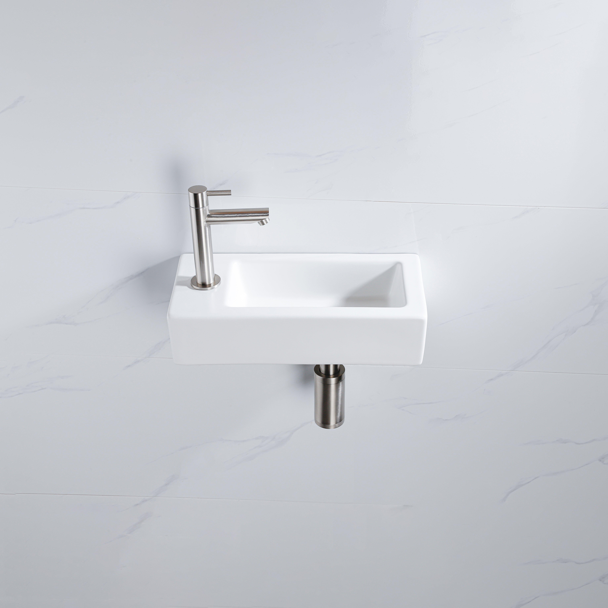comprend un trou de robinet à gauche, un robinet lave-mains en inox brossé, une bonde de vidage et un siphon réduit, ce qui le rend à la fois élégant et pratique. Avec des dimensions de 37.5x18.5x9cm, ce lave-mains s'intègre parfaitement dans des salles de bains modernes et contemporaines, créant une apparence luxueuse.