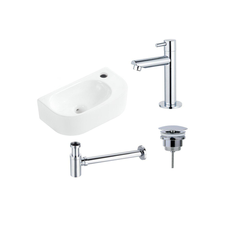 Fugaflow Efficiente Pietra Ensemble de fontaine - 40x21,5x12cm - droite - lisse - demi-ronde - 1 trou de robinet - céramique - robinet de fontaine chrome - bouchon de vidange - siphon abaissé - blanc mat