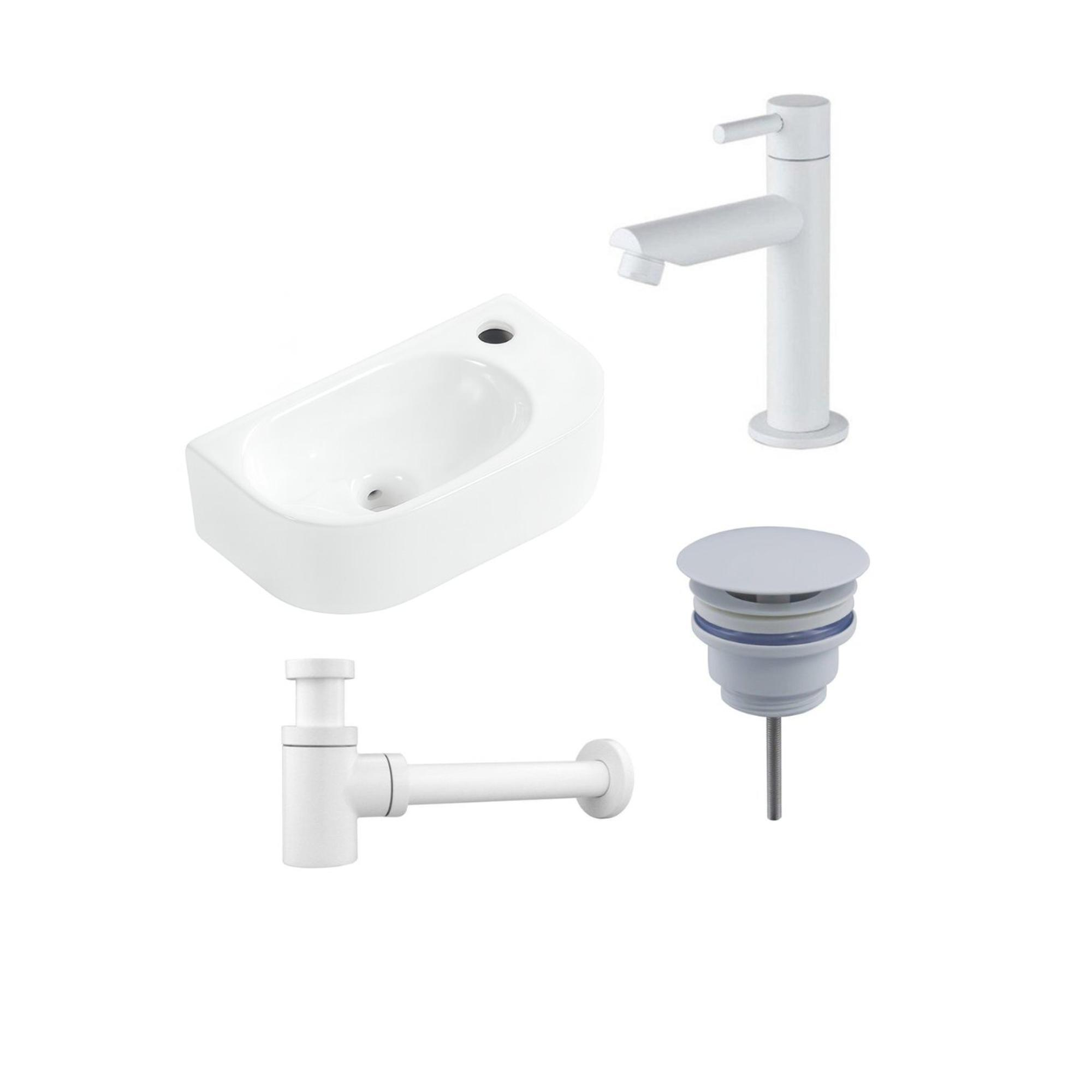 Fugaflow Efficiente Pietra Ensemble de fontaine - 40x21,5x12cm - droite - lisse - demi-rond - 1 trou de robinet - céramique - robinet de fontaine blanc mat - bouchon de vidange - siphon abaissé - blanc mat