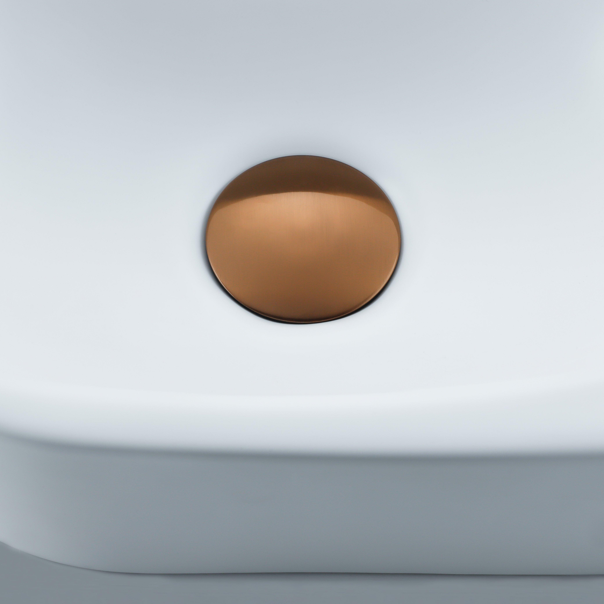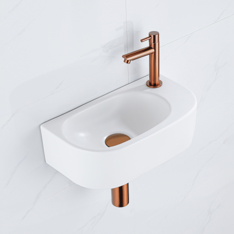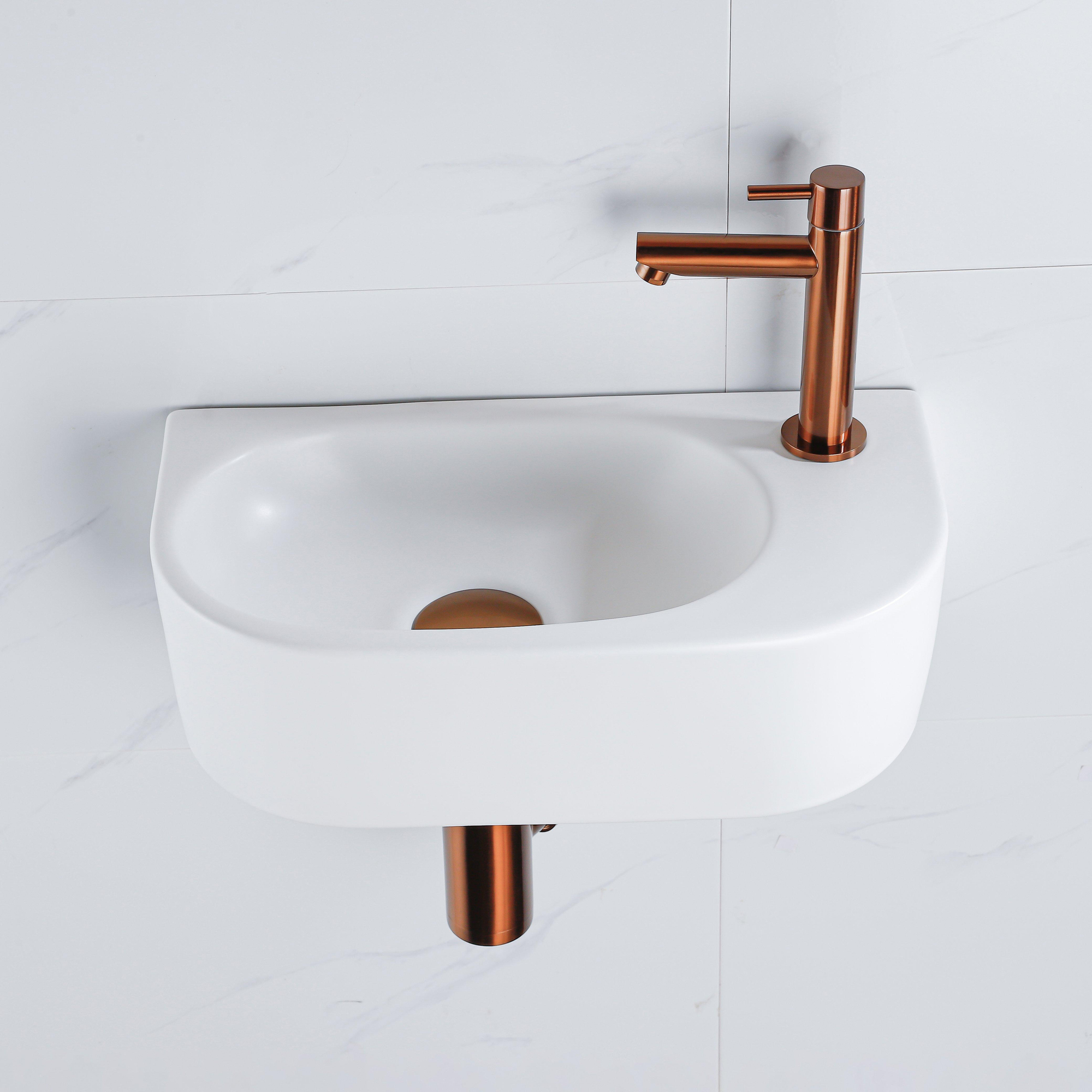 Fugaflow Efficiente Pietra Ensemble de fontaine - 40x21,5x12cm - droite - lisse - demi-ronde - 1 trou de robinet - céramique - robinet de fontaine cuivre brossé - bouchon de vidange - siphon abaissé - blanc mat
