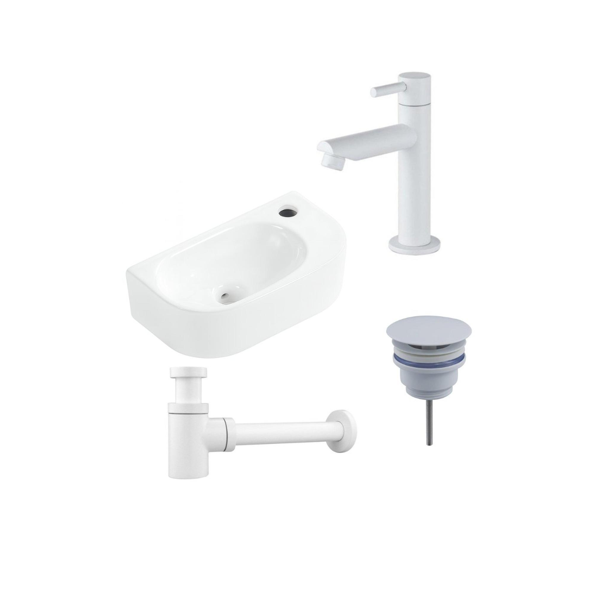 Fugaflow Efficiente Pietra Ensemble de fontaine - 40x21,5x12cm - droite - lisse - demi-rond - 1 trou de robinet - céramique - robinet de fontaine blanc mat - bouchon de vidange - siphon abaissé - blanc mat