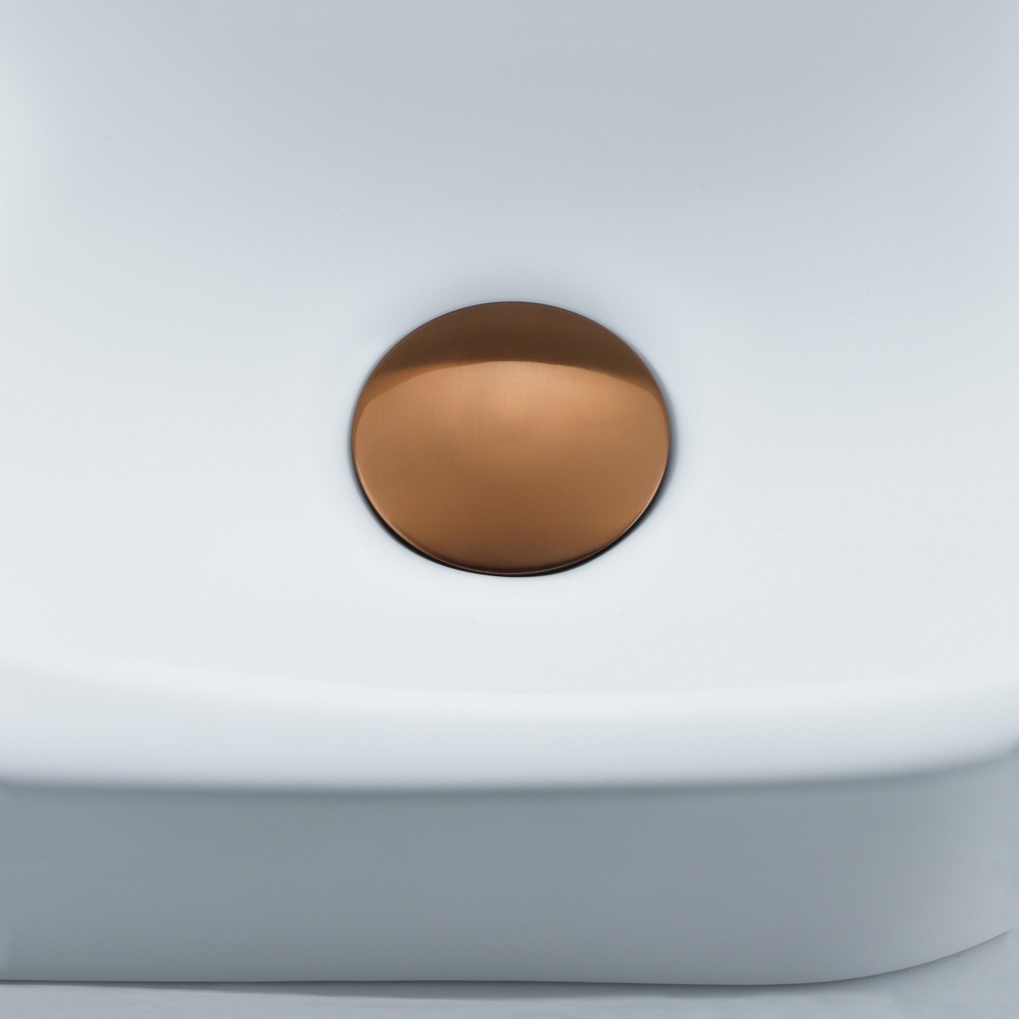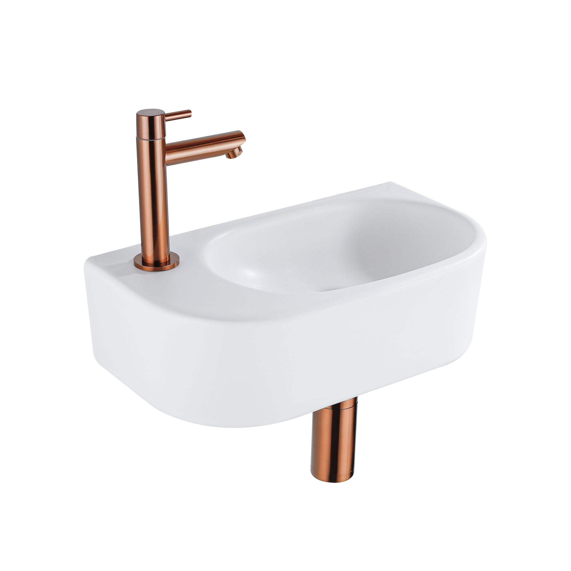 Fugaflow Efficiente Pietra Ensemble de fontaine - 40x21,5x12cm - gauche - lisse - demi-rond - 1 trou de robinet - céramique - robinet de fontaine cuivre brossé - bouchon d'évacuation - siphon abaissé - blanc mat