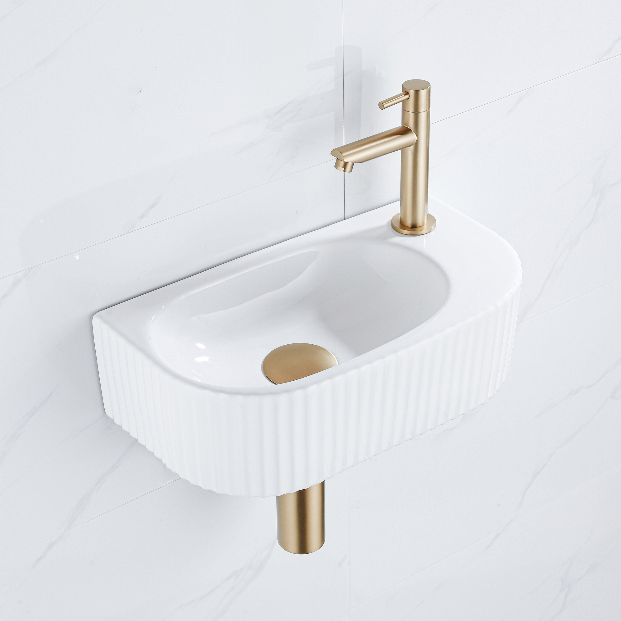 Fugaflow Efficiente Ensemble Fontaine Pietra - 40x21,5x12 cm - droite - rainurée - demi-ronde - 1 trou de robinet - céramique - robinet de fontaine en laiton brossé - bouchon de vidange - siphon abaissé - blanc brillant