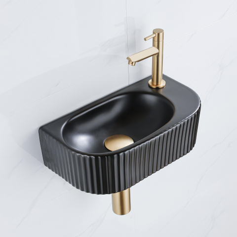 Fugaflow Efficiente Pietra Ensemble lave-mains - 40x21.5x12cm - à droite - nervuré - semi-circulaire - 1 trou de robinet - céramique - robinet de lave-mains laiton brossé - bonde - siphon abaissé - noir mat