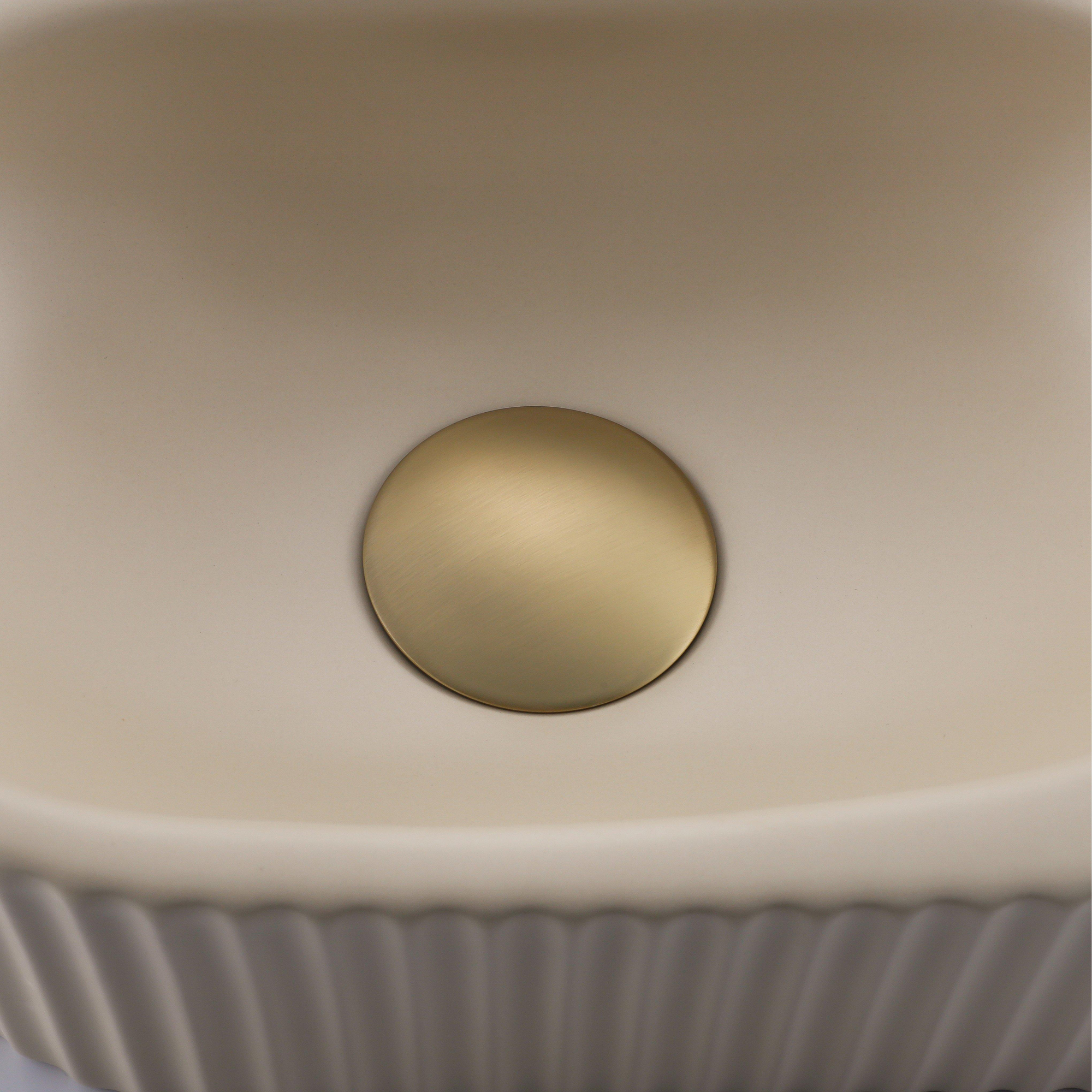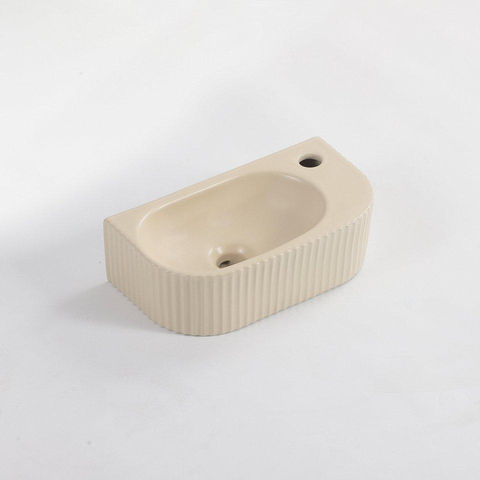 Le Fugaflow Efficiente Pietra Ensemble lavabo d'angle respire l'élégance et le style avec son design semi-circulaire rainuré et son robinet de lavabo en laiton brossé. La subtile couleur beige ajoute une touche de chaleur à chaque salle de bains, tandis que le trou de robinet et le siphon abaissé assurent une apparence épurée et ordonnée.