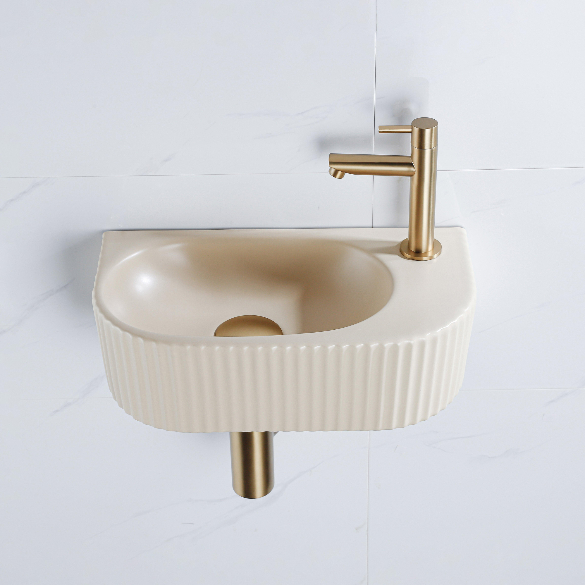 Fugaflow Efficiente Pietra Ensemble lavabo d'angle - 40x21.5x12cm - droit - rainuré - semi-circulaire - 1 trou de robinet - céramique - robinet de lavabo laiton brossé - bonde de vidage - siphon abaissé - beige