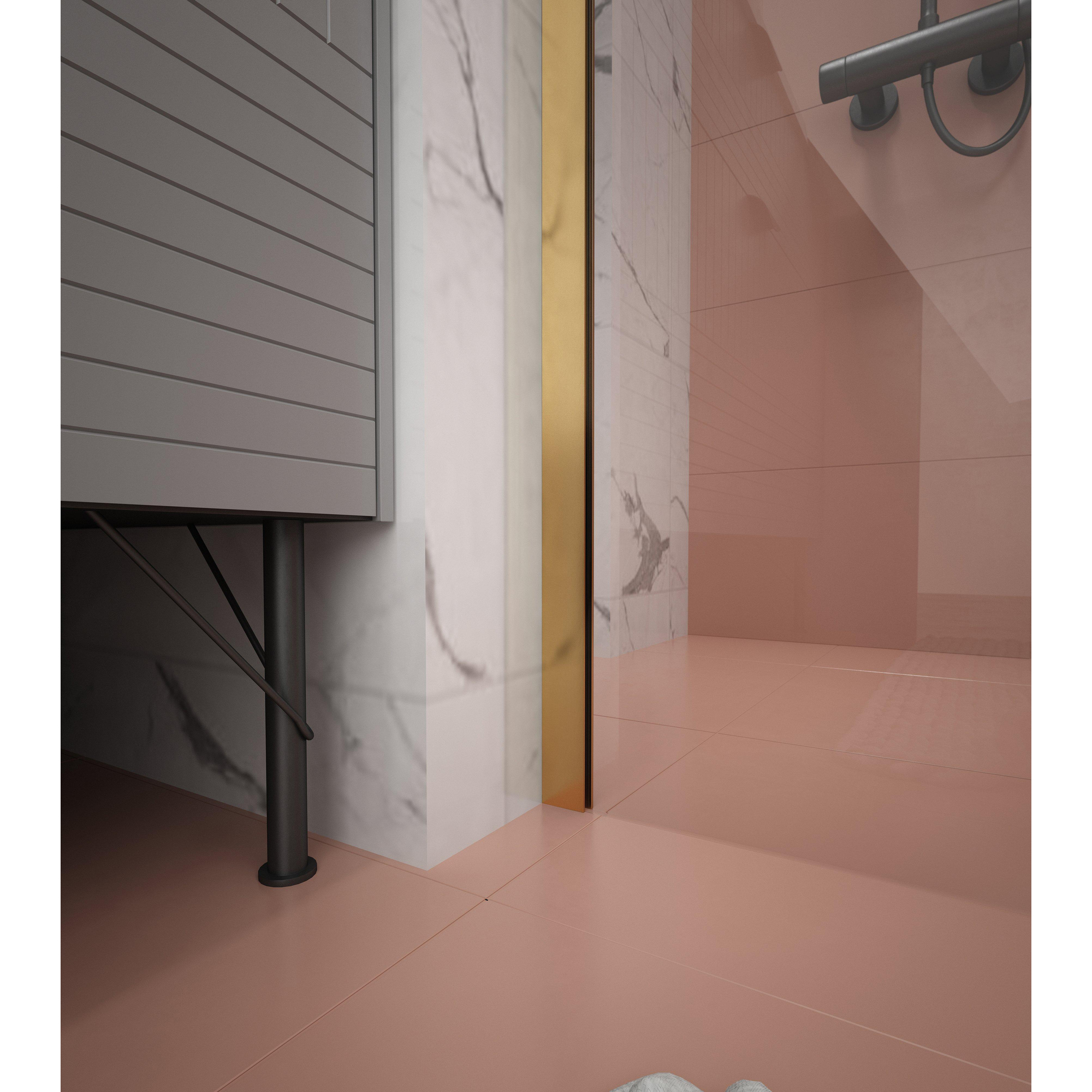 La combinaison de verre clair avec un profilé mural or mat confère à cette douche à l'italienne une apparence intemporelle et raffinée. Cet accent de couleur subtil apporte chaleur et exclusivité à votre salle de bains, sans dominer. Le design épuré s'adapte facilement à divers styles d'intérieur, du moderne au classique. Ainsi, vous profitez non seulement d'une douche fonctionnelle, mais aussi d'un élément stylé qui élève l'ambiance de votre salle de bains.