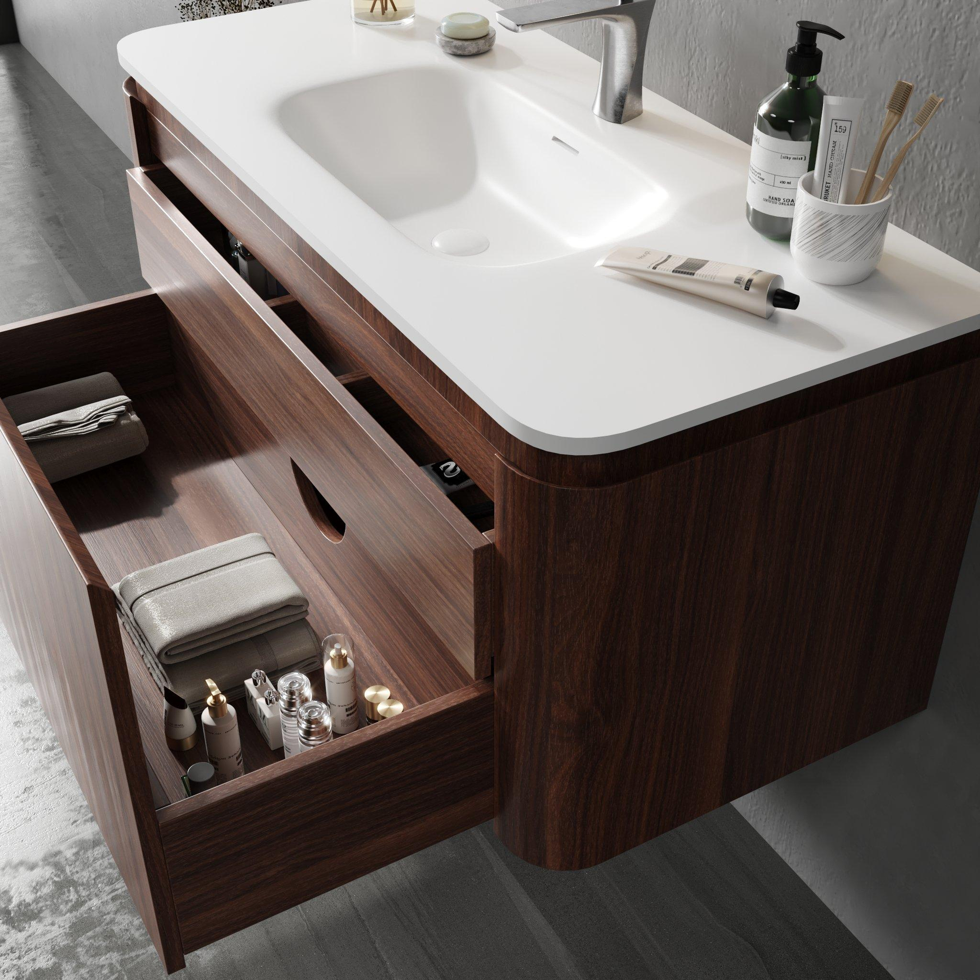 Saniclass Terra Meuble sous vasque - 100cm - 2 tiroirs - vasque en solid surface - 1 cuve - 1 trou de robinet - coins arrondis - châtaignier (noyer)