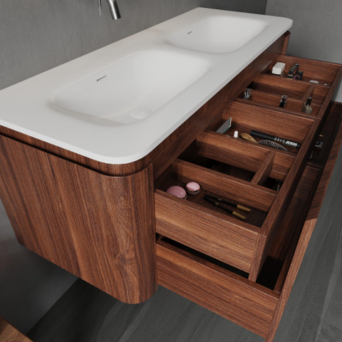 Avec sa couleur châtaignier chaude et sa finition mate, ce meuble apporte un charme naturel et intemporel à votre salle de bains. La combinaison de bois et de solid surface crée une apparence moderne qui s'adapte facilement à différents styles d'intérieur. Les coins arrondis donnent à l'ensemble un look doux et accueillant sans sacrifier la netteté. Ainsi, vous profitez d'une salle de bains à la fois élégante et contemporaine. Grâce à la conception réfléchie, votre salle de bains devient un endroit où vous commencez et terminez chaque jour avec plaisir.