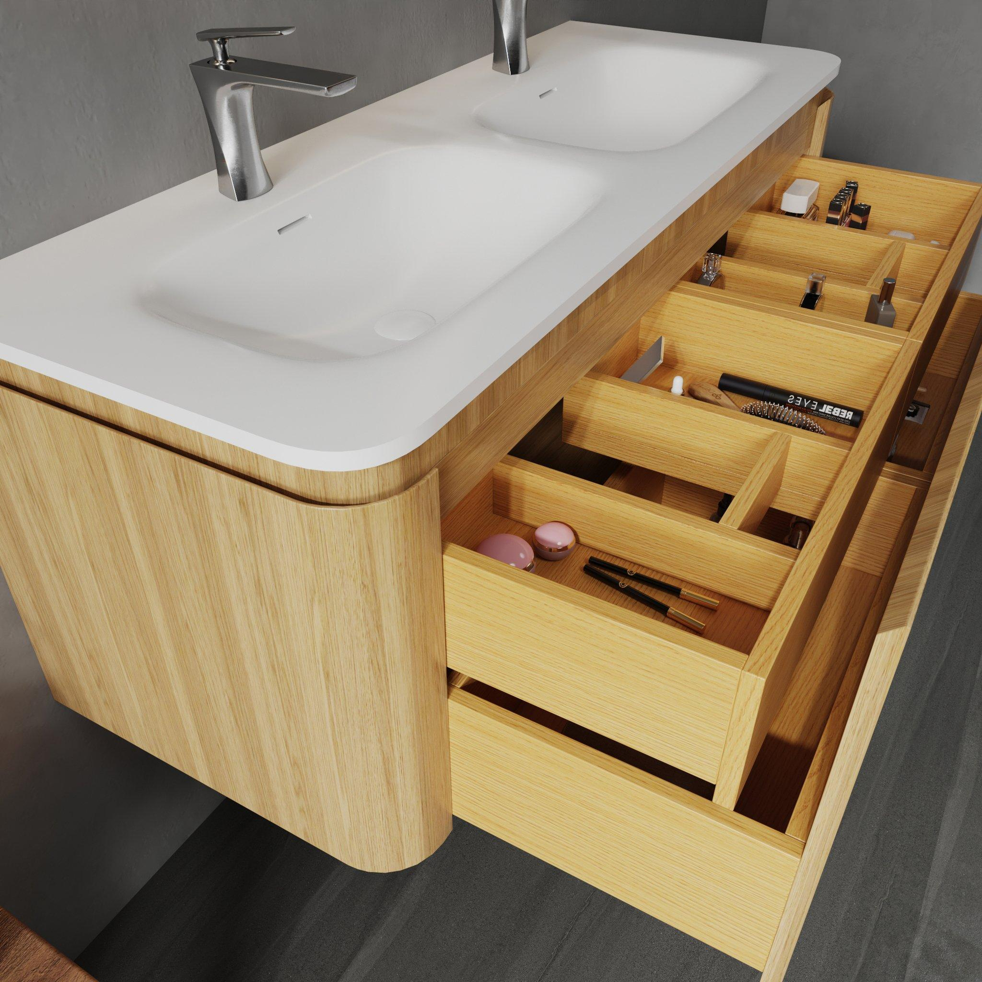 Avec ce magnifique meuble, vous donnez à votre salle de bains une mise à jour élégante et fonctionnelle. Il combine une apparence chaleureuse de chêne clair avec un design épuré et un espace de rangement pratique. Grâce aux deux grands tiroirs, vous rangez tous vos accessoires de salle de bains de manière ordonnée et claire, tandis que le lavabo solide en solid surface offre une finition moderne et durable. Les coins arrondis apportent une apparence douce et accueillante et rendent le meuble sûr et adapté aux enfants. Avec deux trous de robinet, vous avez en outre la flexibilité de choisir votre robinet idéal et de l’installer facilement. Ce meuble n’est pas simplement un ajout, mais une véritable transformation pour votre salle de bains dont vous profiterez chaque jour.