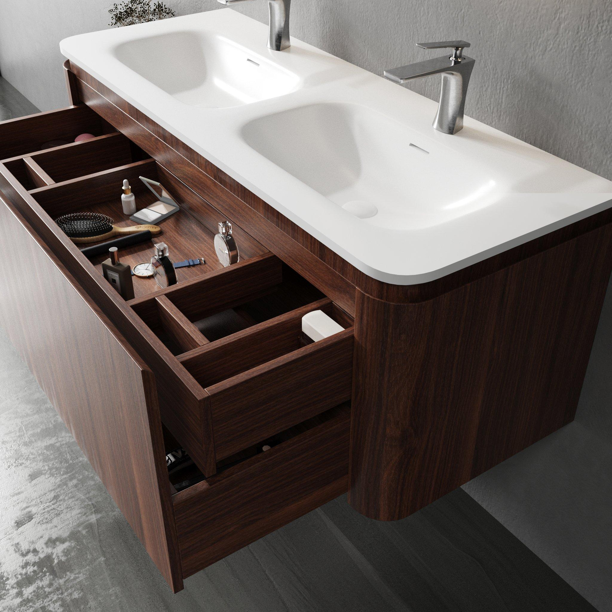La couleur chaude châtaignier combinée au plateau en solid surface mat et épuré confère un aspect intemporel et élégant. Ce meuble s'intègre parfaitement dans les salles de bains modernes comme classiques. Les coins arrondis subtils adoucissent l'ensemble et apportent une touche raffinée au design. Grâce à l'utilisation de matériaux de haute qualité, le meuble dégage une impression de qualité et fait de votre salle de bains un lieu dont vous êtes fier. Avec ce meuble, vous obtenez un véritable accroche-regard qui donne un coup de neuf à votre salle de bains sans la dominer.