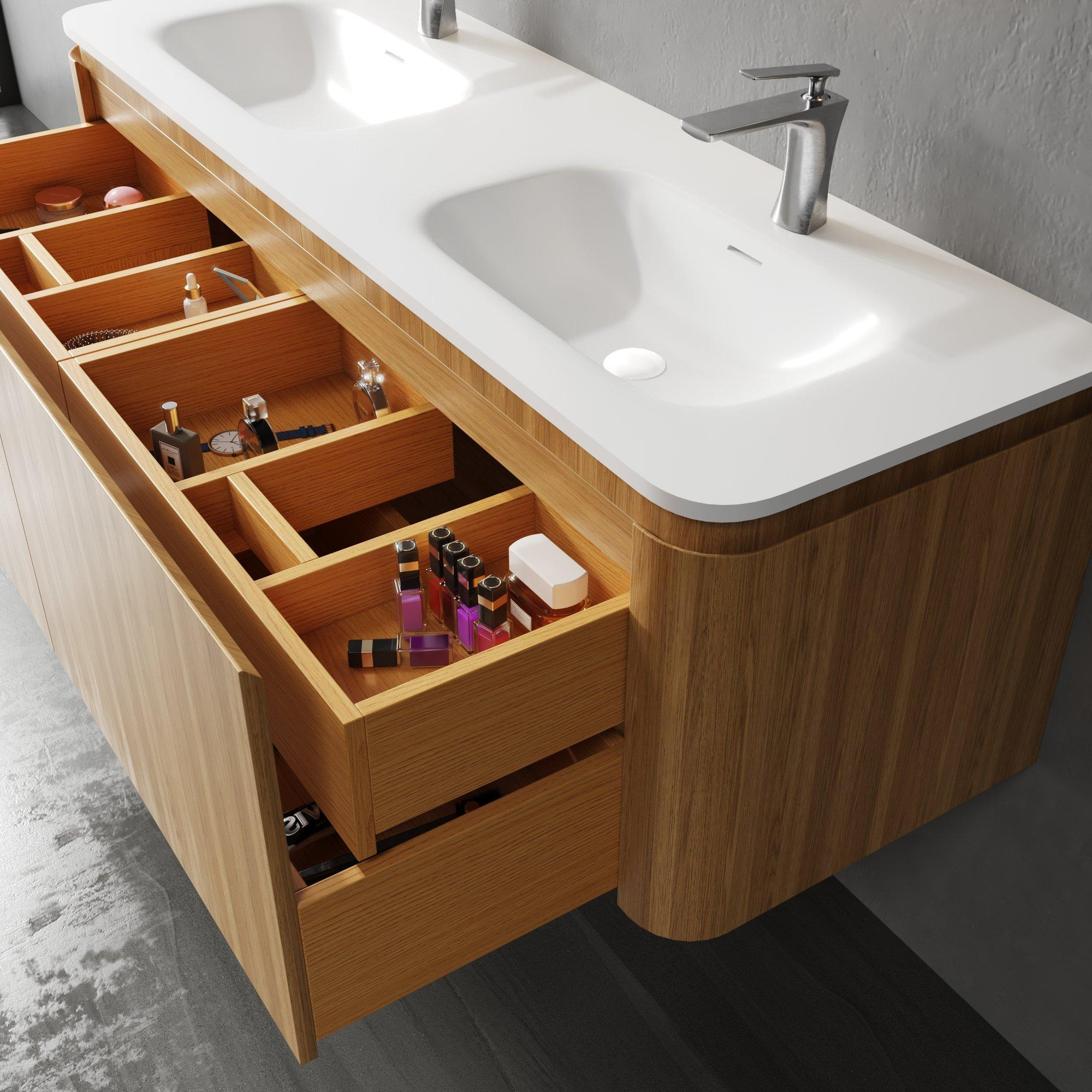 Avec deux vasques et deux trous de robinet, ce meuble sous lavabo est parfait pour les familles ou les couples qui aiment utiliser la salle de bains ensemble. Les quatre grands tiroirs offrent suffisamment d'espace de rangement pour les serviettes, les produits de soin et autres essentiels, afin que vous ayez toujours tout à portée de main. Les coins arrondis assurent une sécurité supplémentaire et un aspect doux, tandis que la fixation murale crée une sensation d'espace et facilite le nettoyage du sol. Ce meuble combine des détails intelligents avec un design réfléchi, pour que votre salle de bains soit non seulement belle, mais aussi pratique.