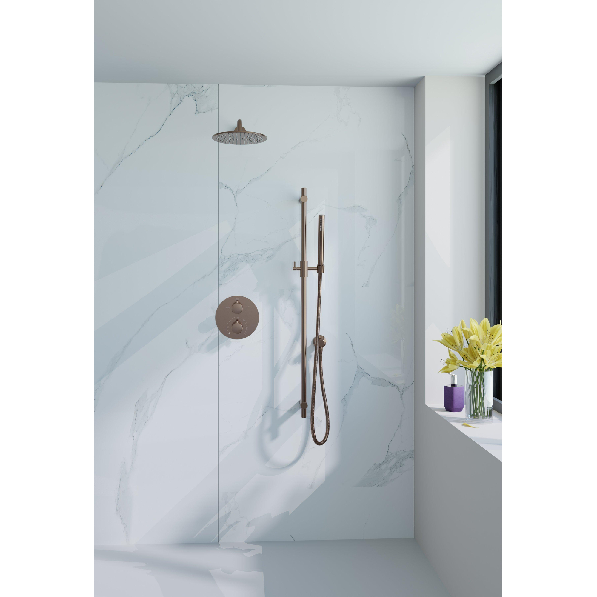 FugaFlow Eccelente Acces Ensemble de douche pluie encastré - rond - thermostatique - bras mural - barre coulissante - pomme de douche principale 25cm - douchette à main - Cuivre brossé PVD (Cuivre)