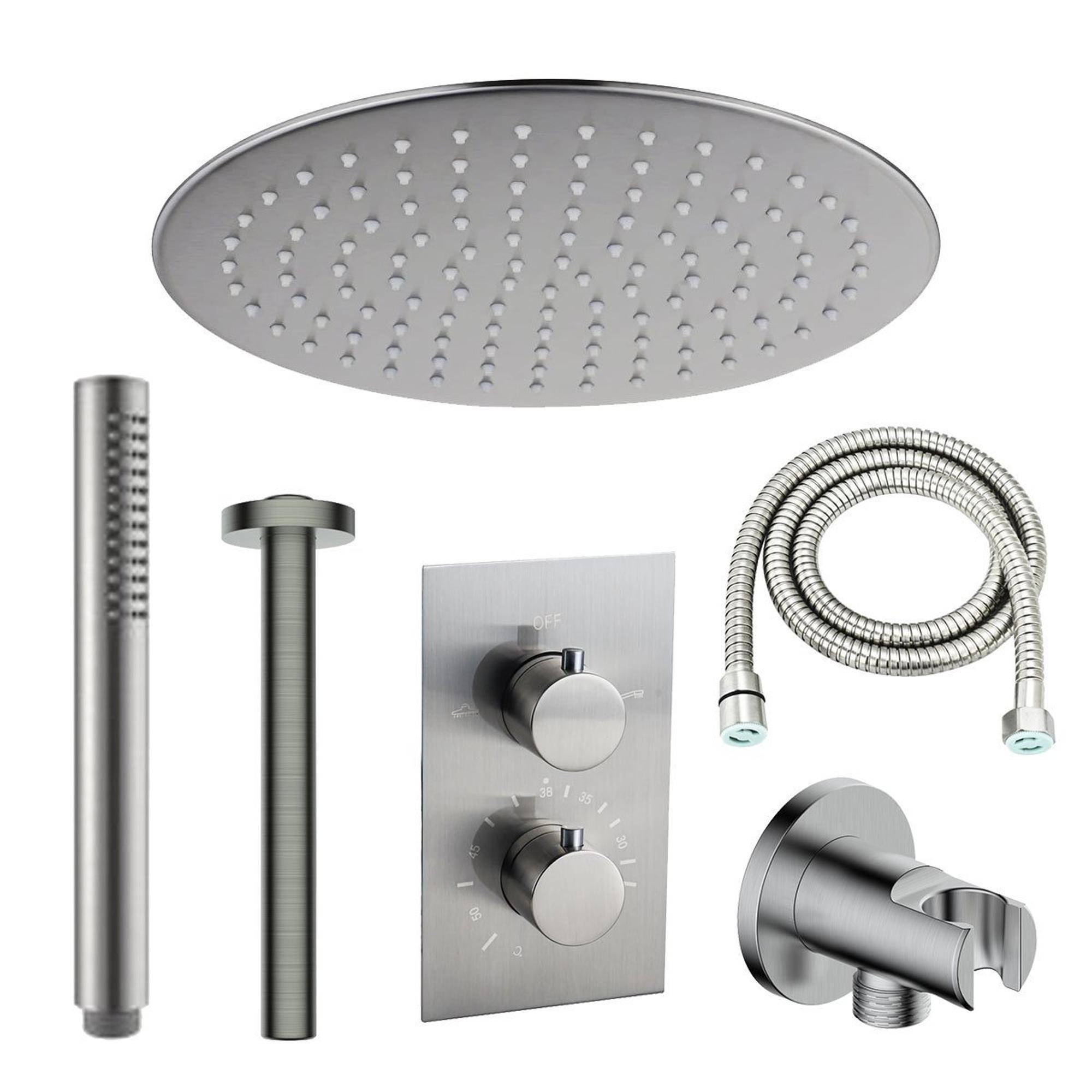 FugaFlow Eccelente Acces Ensemble de douche de pluie encastré - thermostatique - bras de plafond - douchette de tête 30cm - douchette à main sur barre - flexible de douche lisse - Acier inoxydable brossé PVD