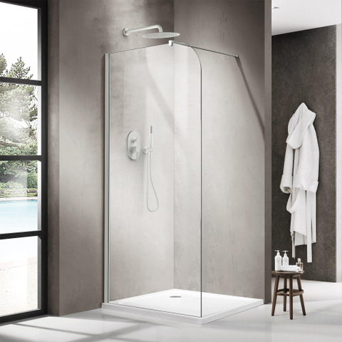 Le verre clair et la paroi arrondie apportent une sensation d'espace et de luminosité, tandis que le bras mural mat blanc ajoute une touche contemporaine et raffinée à votre espace.