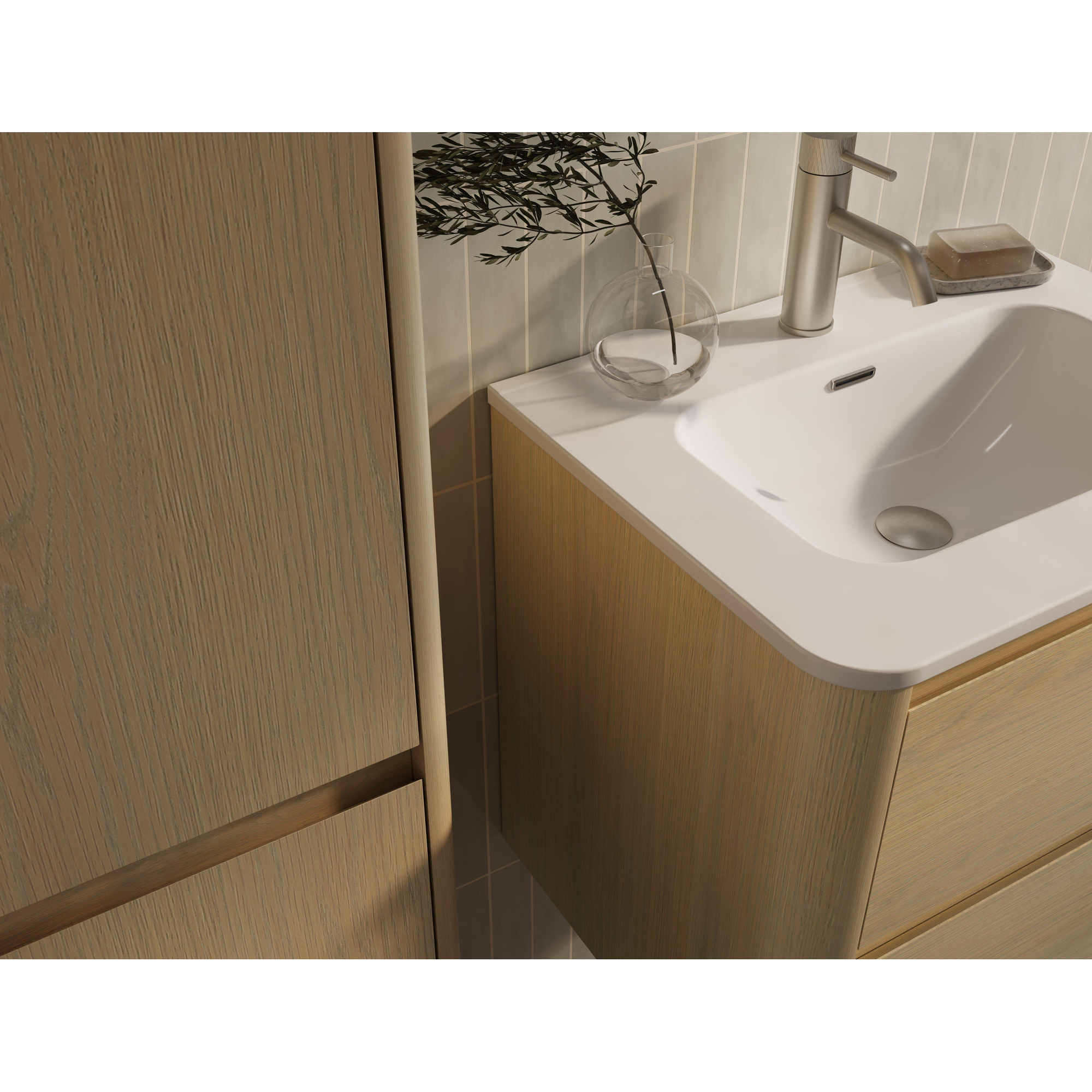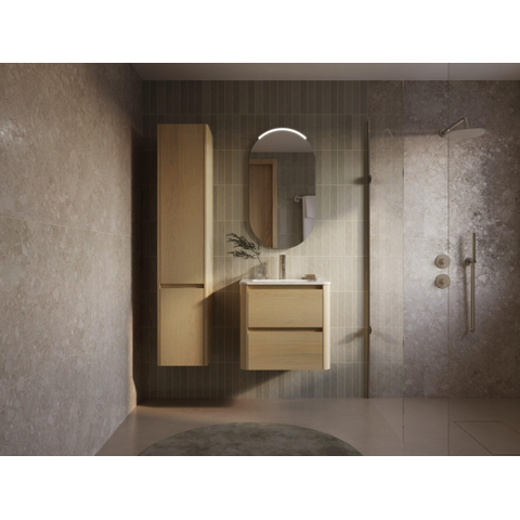 Avec une largeur d’environ 62 cm et une profondeur d’environ 46 cm, vous exploitez de manière optimale l’espace disponible sans sacrifier votre liberté de mouvement. Idéal si votre salle de bains n’est pas très grande, mais que vous avez tout de même besoin d’un espace de rangement pratique pour les serviettes, les produits de soin et les produits d’entretien. Les deux tiroirs spacieux vous aident à tout ranger de manière structurée, de sorte que le plan autour du lavabo reste propre et dégagé. Comme le meuble est monté au mur, le sol paraît plus grand et vous créez un ensemble léger et moderne. Ce n’est pas seulement esthétiquement attrayant, mais cela rend également le nettoyage du sol beaucoup plus simple.