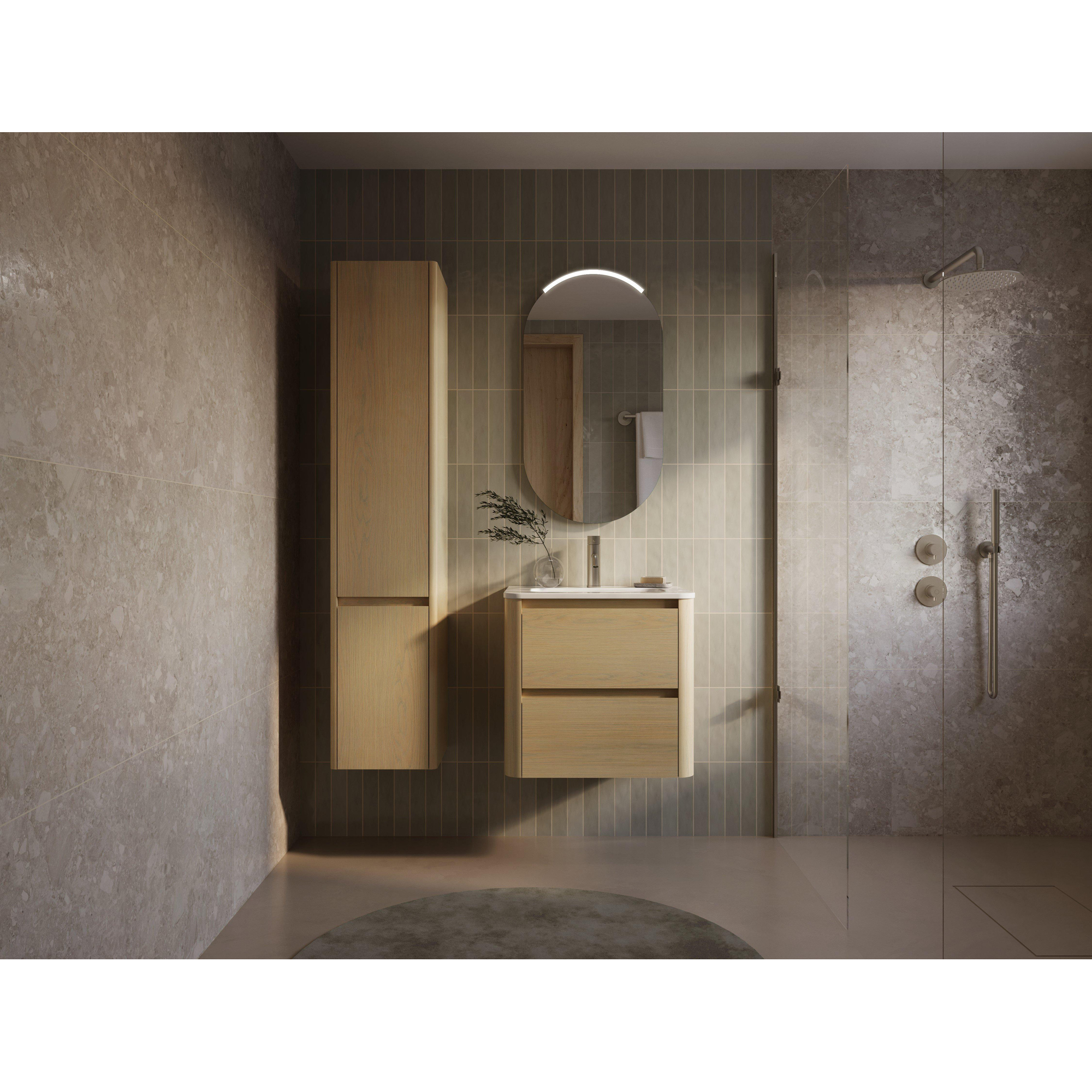 Vous recherchez une solution de salle de bains compacte mais complète, à la fois élégante et pratique ? Alors cet ensemble complet avec lavabo et meuble bas est un choix judicieux. Grâce au lavabo blanc brillant aux lignes épurées et à la façade en placage bois chaleureux, ce meuble s’intègre sans effort dans une salle de bains moderne, mais aussi dans un style intemporel ou scandinave. Les dimensions sont idéales pour les salles de bains petites à moyennes ou un espace toilettes généreux, où vous souhaitez avoir suffisamment d’espace de rangement sans que le meuble paraisse trop massif. Les façades sans poignée assurent une apparence épurée et luxueuse et rendent l’ensemble particulièrement facile à utiliser. Si vous optez pour un espace de toilette net et ordonné avec beaucoup de confort d’utilisation et une apparence haut de gamme, cet ensemble répond parfaitement à vos attentes.