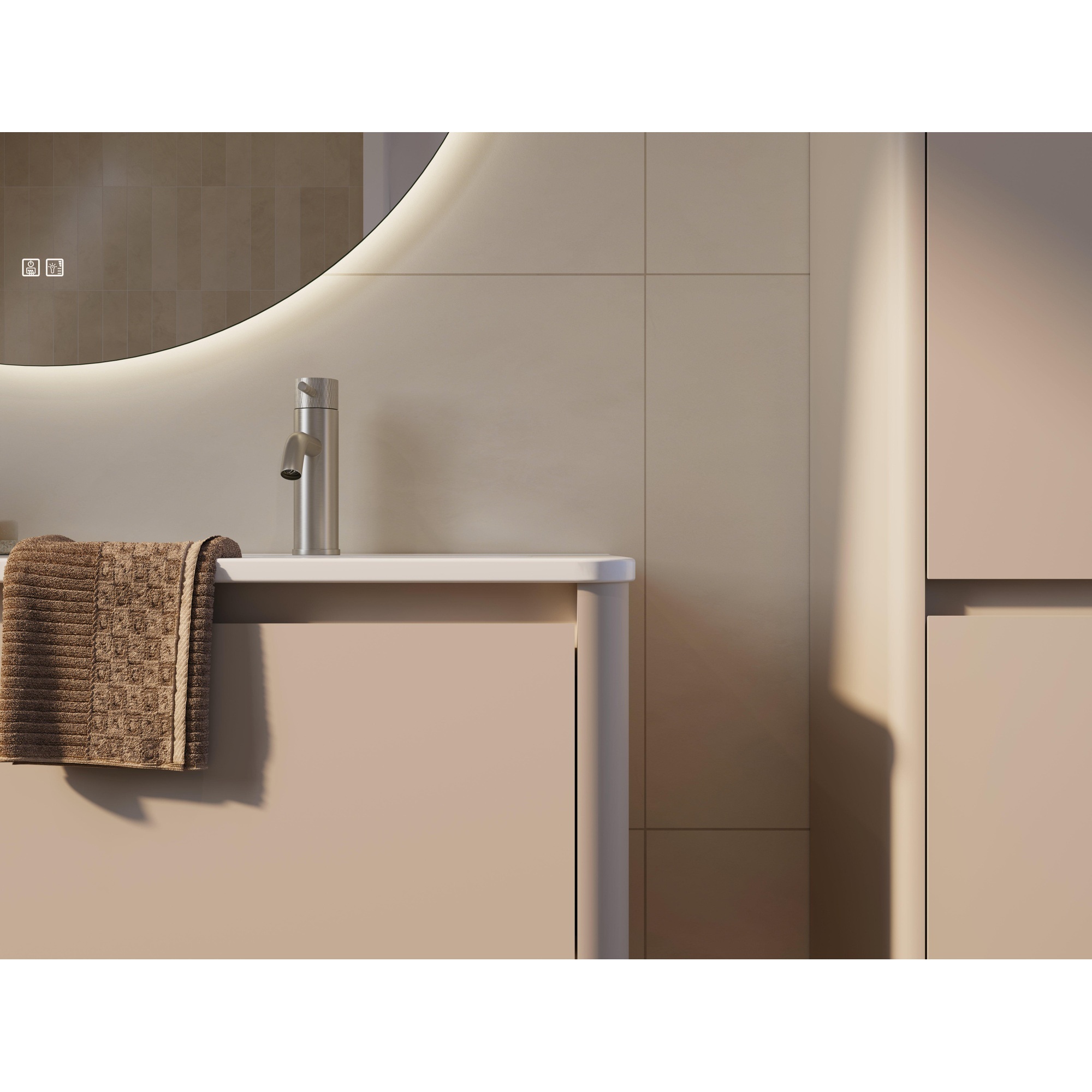La couleur beige Sahara Sand confère immédiatement à votre salle de bains une ambiance douce et accueillante. La teinte chaude se combine aisément avec des carreaux blancs, couleur sable ou terre, et s'accorde également parfaitement avec des robinets et accessoires noirs, chromés ou en métal brossé. Grâce au placage bois, il en résulte en outre une apparence naturelle et haut de gamme sans que vous ne fassiez de concession sur la facilité d'utilisation pratique. La forme rectangulaire aux angles arrondis paraît à la fois moderne et chaleureuse, de sorte que le meuble ne donne pas une impression dure ou anguleuse dans l'espace. Vous créez ainsi une atmosphère détendue, digne d'un spa, même dans une salle de bains plus compacte.