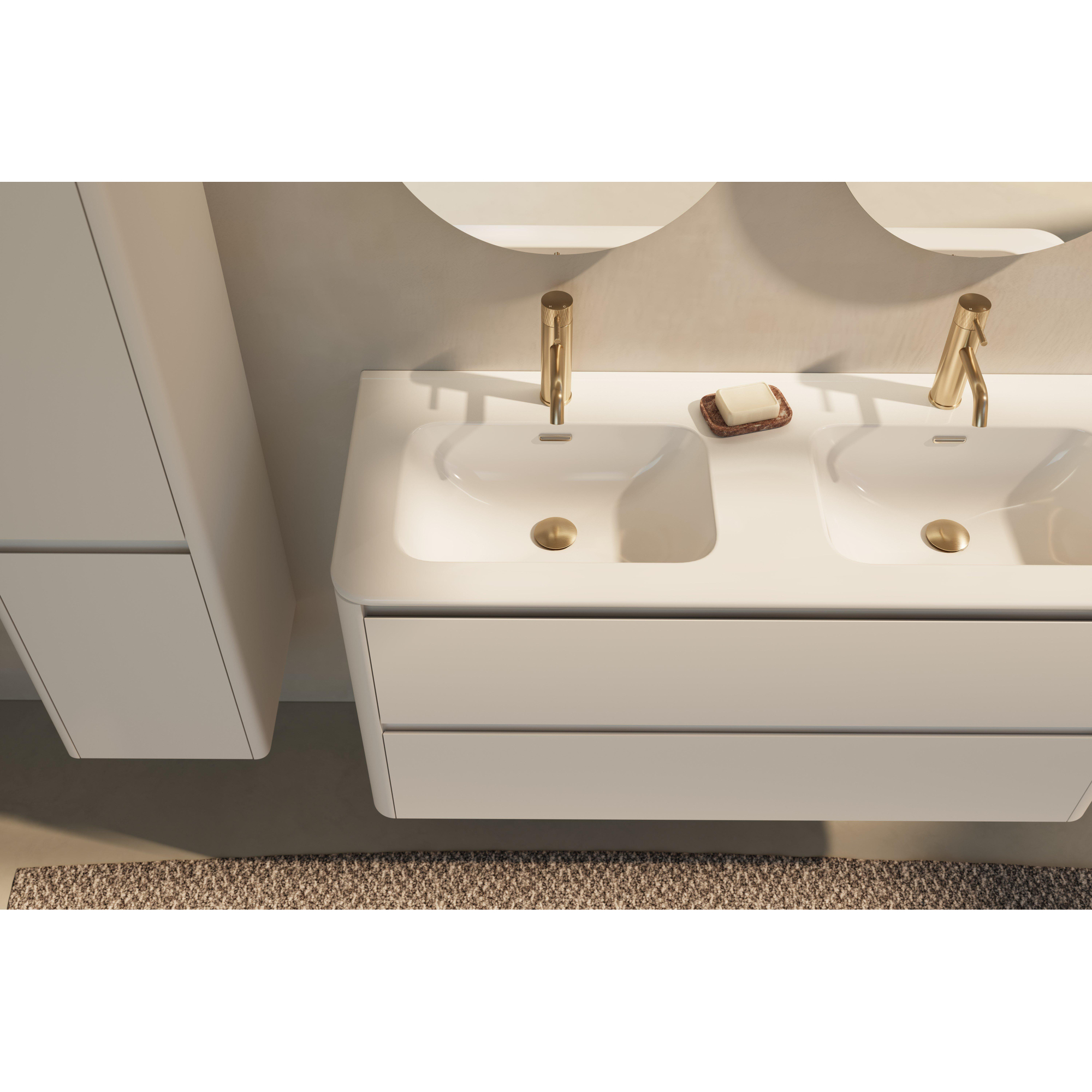 Avec une largeur d’environ 122 cm et deux grands tiroirs, cet ensemble offre largement assez de place pour tous vos accessoires de salle de bains quotidiens. Des serviettes au sèche-cheveux, des produits de soin aux savons de réserve : tout trouve une place fixe, afin que votre plan reste net et calme visuellement. Le design sans poignées avec profil de préhension intégré vous permet d’ouvrir les tiroirs confortablement, même avec les mains mouillées. Grâce à l’agencement astucieux, votre plan de lavabo reste libre pour les objets que vous utilisez vraiment souvent. Cela rend le rush du matin beaucoup plus clair, surtout si vous partagez la salle de bains avec plusieurs membres de la famille.