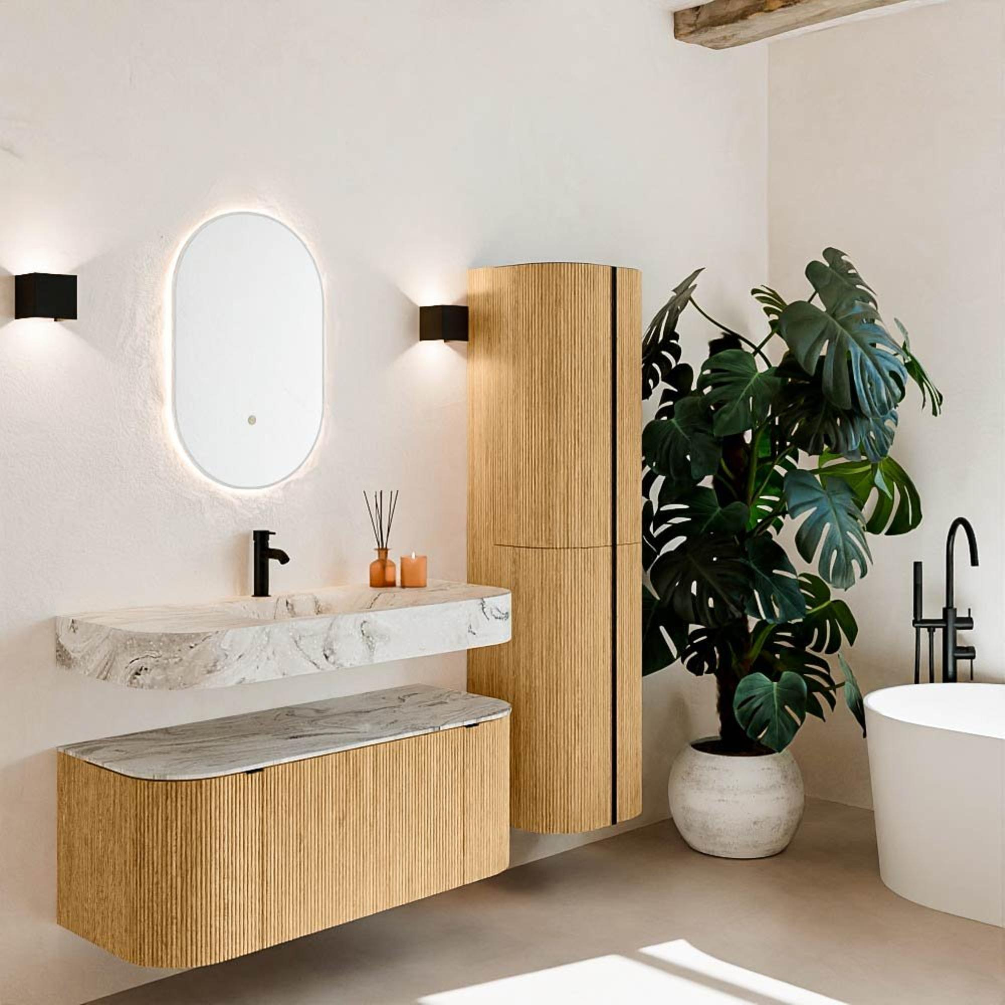 Matériaux naturels dans des tons chauds. Les rainures verticales apportent rythme et texture au design, tandis que le chêne confère une apparence chaleureuse et artisanale. Choisissez parmi 5 teintes de bois OAK, WALNUT, DUSK, SHADOW et RUBY, des couleurs de bois soigneusement sélectionnées pour enrichir les salles de bains modernes et classiques.