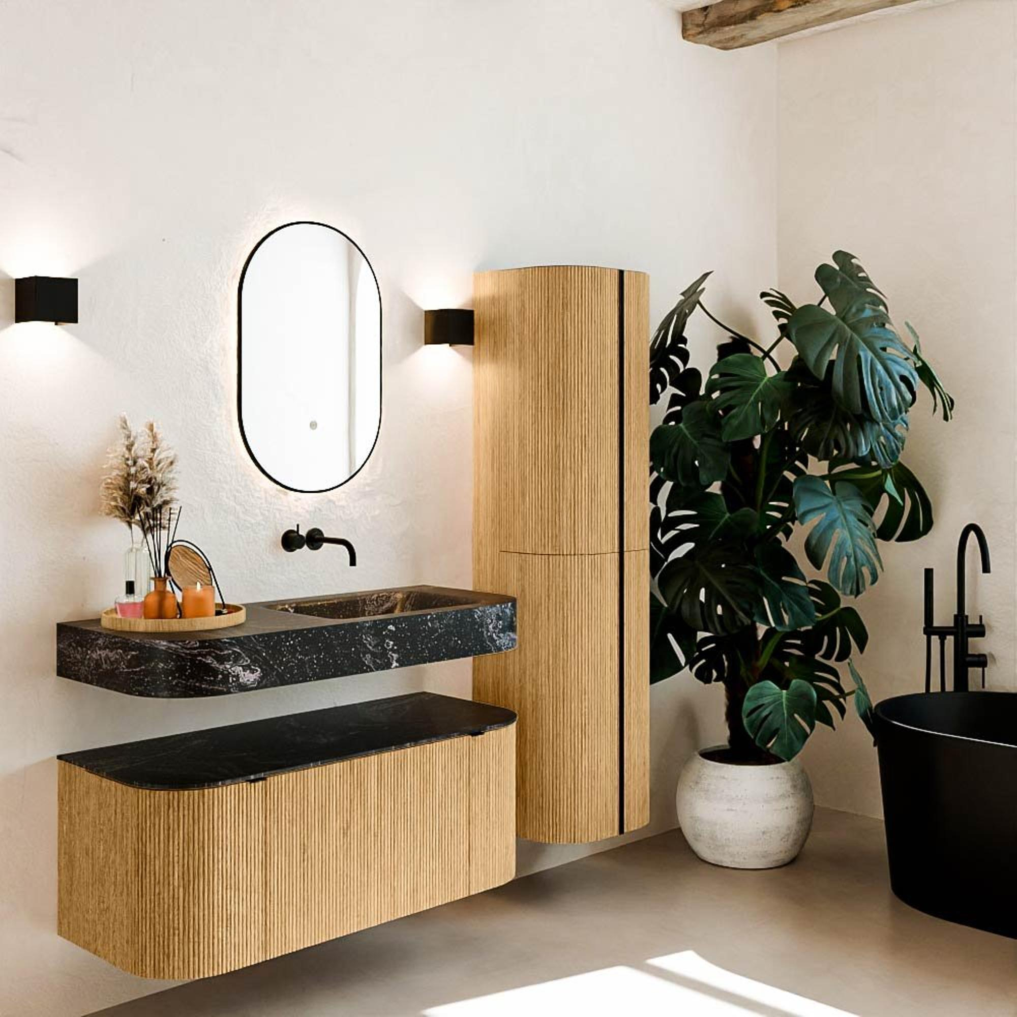 Matériaux naturels aux teintes chaudes. Les nervures verticales apportent rythme et texture au design, tandis que le chêne confère une apparence chaleureuse et artisanale. Choisissez parmi 5 teintes de bois OAK, WALNUT, DUSK, SHADOW et RUBY, des couleurs de bois soigneusement sélectionnées pour enrichir les salles de bains modernes et classiques.