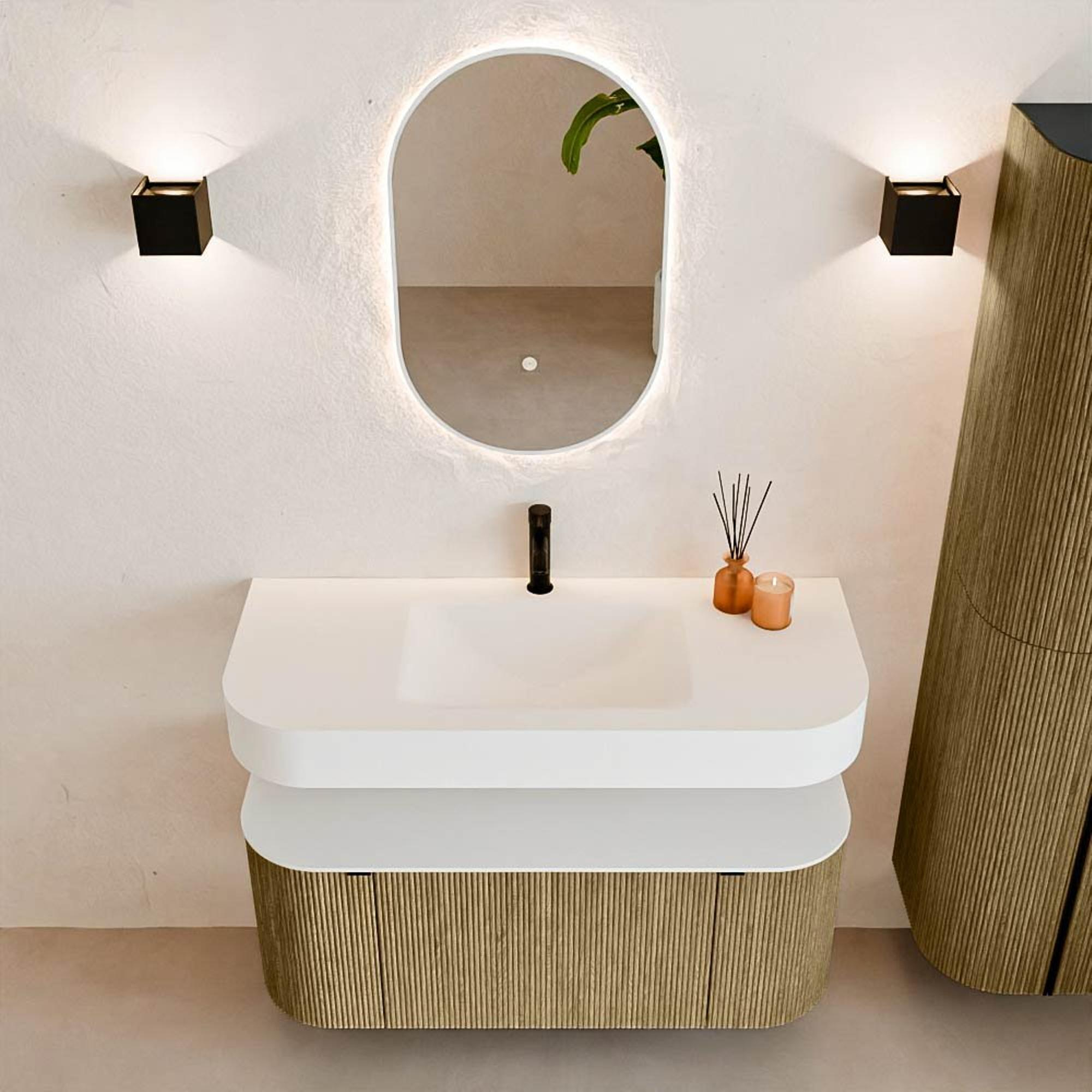 Au-dessus du meuble flotte une vasque suspendue assortie aux coins arrondis – parfaitement adaptée à la forme du meuble. La vasque est réalisée en Solid Surface et suit subtilement les lignes du meuble inférieur, créant un ensemble harmonieux. Le plan de travail en Solid Surface constitue une base solide et facile d’entretien, complétant la combinaison.
