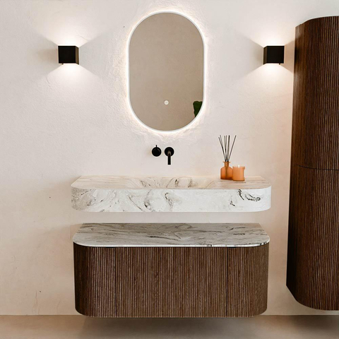 Matériaux naturels dans des tons chauds. Les nervures verticales apportent rythme et texture au design, tandis que le chêne confère une apparence chaleureuse et artisanale. Choisissez parmi 5 teintes de bois OAK, WALNUT, DUSK, SHADOW et RUBY, des couleurs de bois soigneusement sélectionnées pour enrichir les salles de bains modernes et classiques.