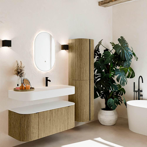 Matériaux naturels aux teintes chaudes. Les nervures verticales apportent rythme et texture au design, tandis que le chêne confère une apparence chaleureuse et artisanale. Choisissez parmi 5 teintes de bois OAK, WALNUT, DUSK, SHADOW et RUBY, des couleurs de bois soigneusement sélectionnées pour enrichir les salles de bains modernes et classiques.