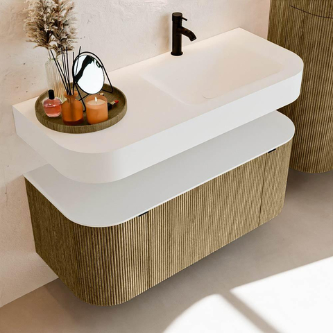 Au-dessus du meuble flotte une vasque suspendue assortie aux angles arrondis – parfaitement adaptée à la forme du meuble. La vasque est en Solid Surface et suit subtilement les lignes du meuble inférieur, créant un ensemble harmonieux. Le plan de travail en Solid Surface constitue une base solide, facile d'entretien et complète la combinaison.