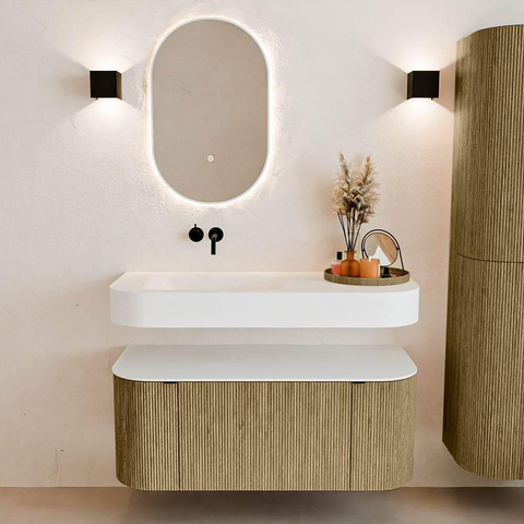 Au-dessus du meuble flotte une vasque suspendue assortie aux coins arrondis – parfaitement adaptée à la forme du meuble. La vasque est réalisée en Solid Surface et suit subtilement les lignes du meuble inférieur, créant une harmonie parfaite. Le plan de travail en Solid Surface forme une base solide, facile d'entretien, complétant ainsi l'ensemble.