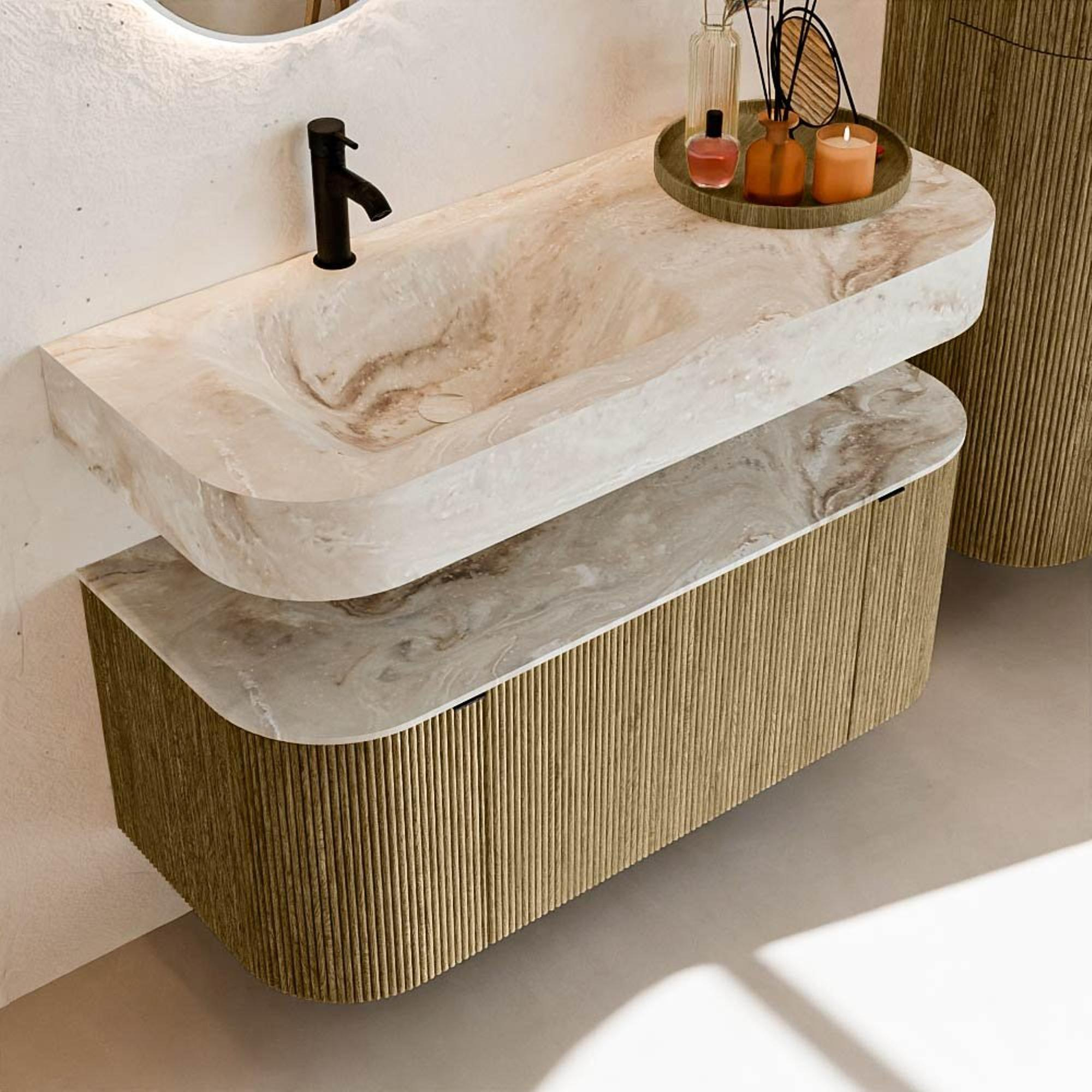 Matériaux naturels dans des tons chauds. Les nervures verticales apportent rythme et texture au design, tandis que le chêne confère une apparence chaleureuse et artisanale. Choisissez parmi 5 teintes de bois OAK, WALNUT, DUSK, SHADOW et RUBY, des couleurs de bois soigneusement sélectionnées pour enrichir les salles de bains modernes et classiques.