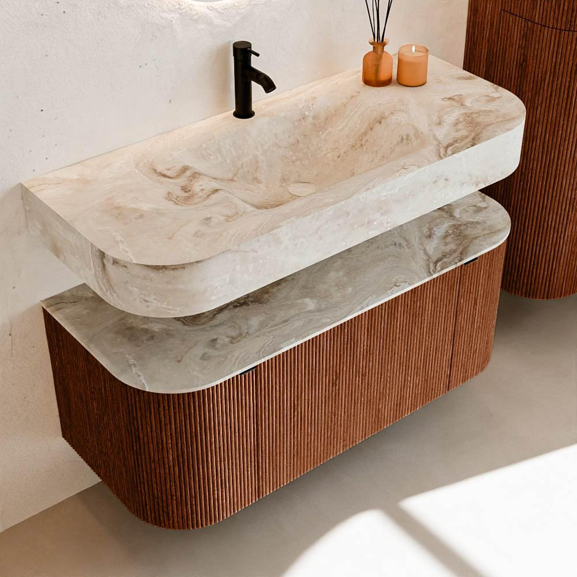 Au-dessus du meuble flotte une vasque suspendue assortie aux coins arrondis – parfaitement adaptée à la forme du meuble. La vasque est en Solid Surface et suit subtilement les lignes du meuble inférieur, créant un ensemble harmonieux. Le plan de travail en Solid Surface constitue une base solide et facile d'entretien et complète la combinaison.
