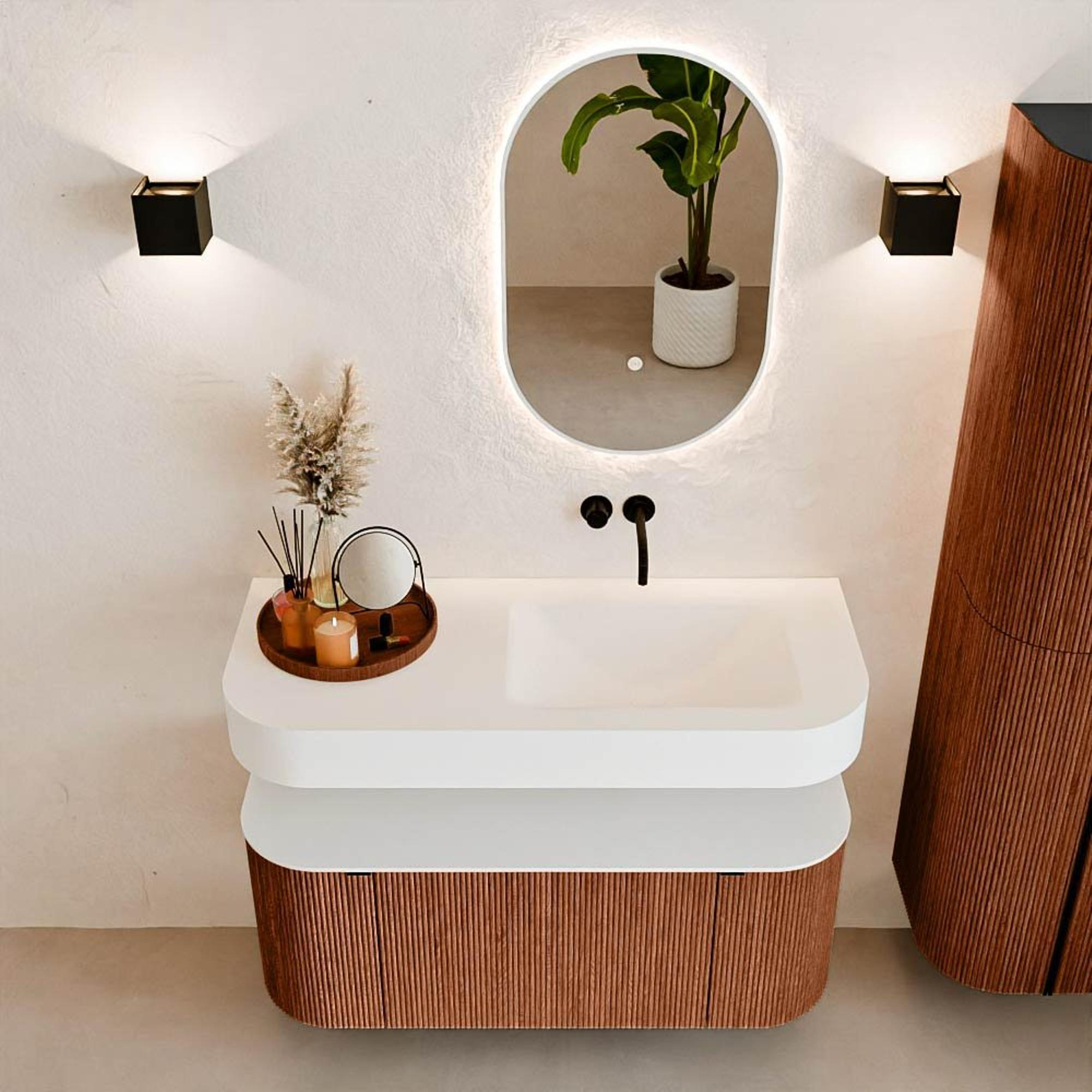 Au-dessus du meuble flotte une vasque suspendue assortie aux coins arrondis – parfaitement adaptée à la forme du meuble. La vasque est en Solid Surface et suit subtilement les lignes du meuble en dessous, créant une harmonie parfaite. Le plan de travail en Solid Surface forme une base solide, facile d'entretien et complète la combinaison.