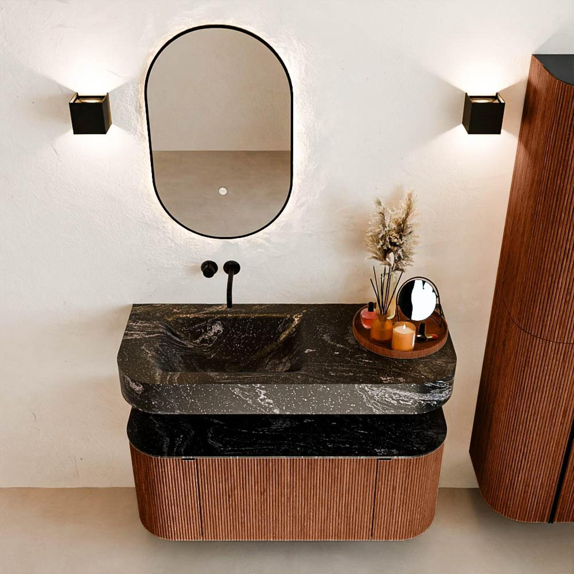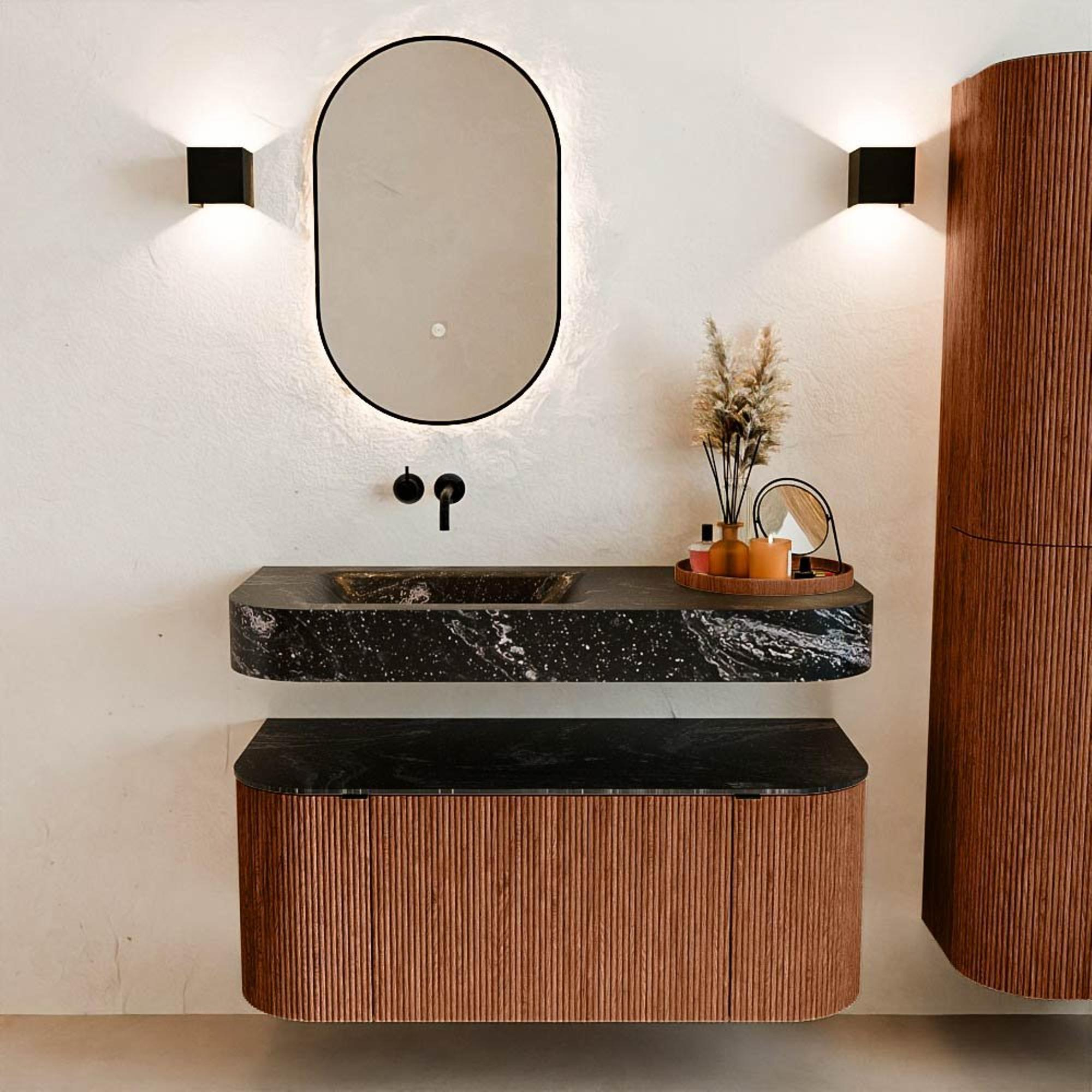 Matériaux naturels dans des tons chauds. Les nervures verticales apportent rythme et texture au design, tandis que le chêne confère une apparence chaleureuse et artisanale. Choisissez parmi 5 teintes de bois OAK, WALNUT, DUSK, SHADOW et RUBY, des couleurs de bois soigneusement sélectionnées pour enrichir les salles de bains modernes et classiques.