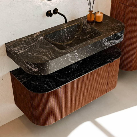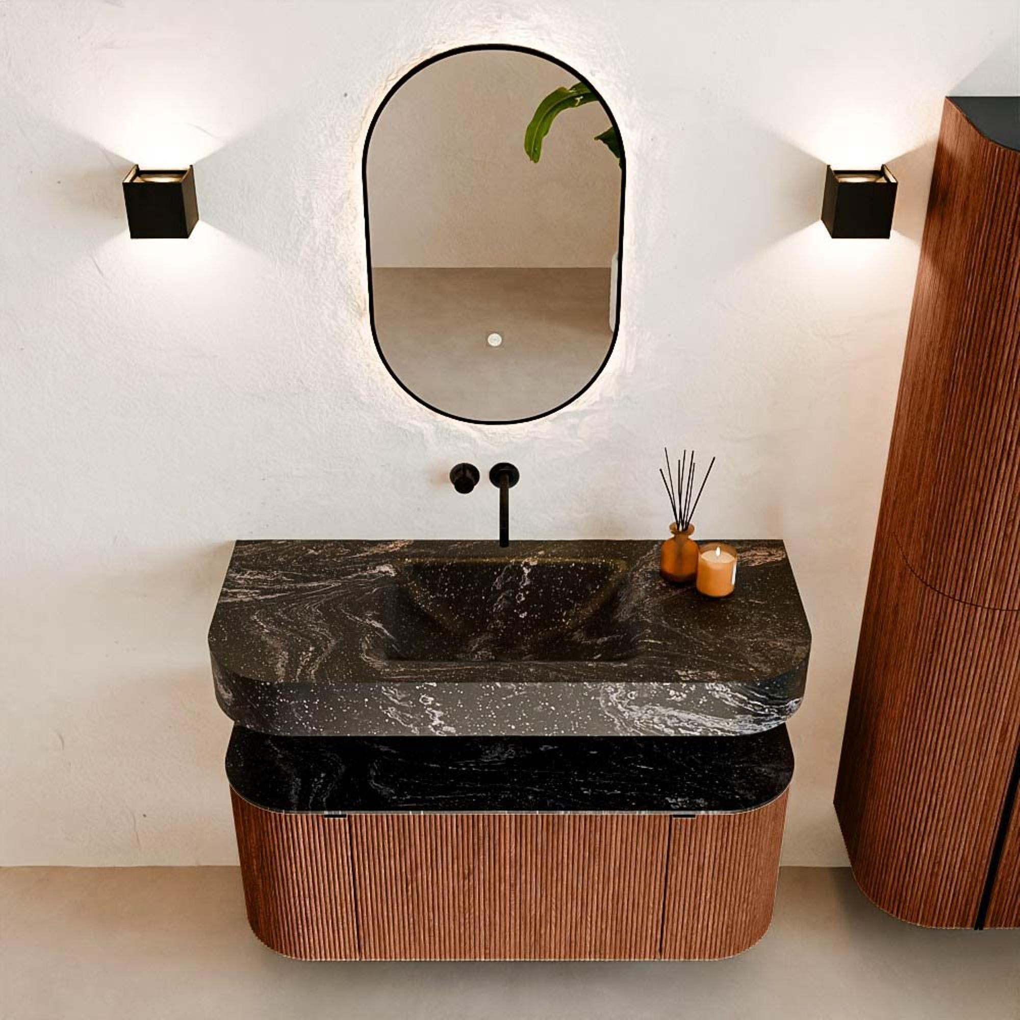 Matériaux naturels aux teintes chaudes. Les nervures verticales apportent rythme et texture au design, tandis que le chêne confère une apparence chaleureuse et artisanale. Choisissez parmi 5 teintes de bois OAK, WALNUT, DUSK, SHADOW et RUBY, des couleurs de bois soigneusement sélectionnées pour enrichir les salles de bains modernes et classiques.