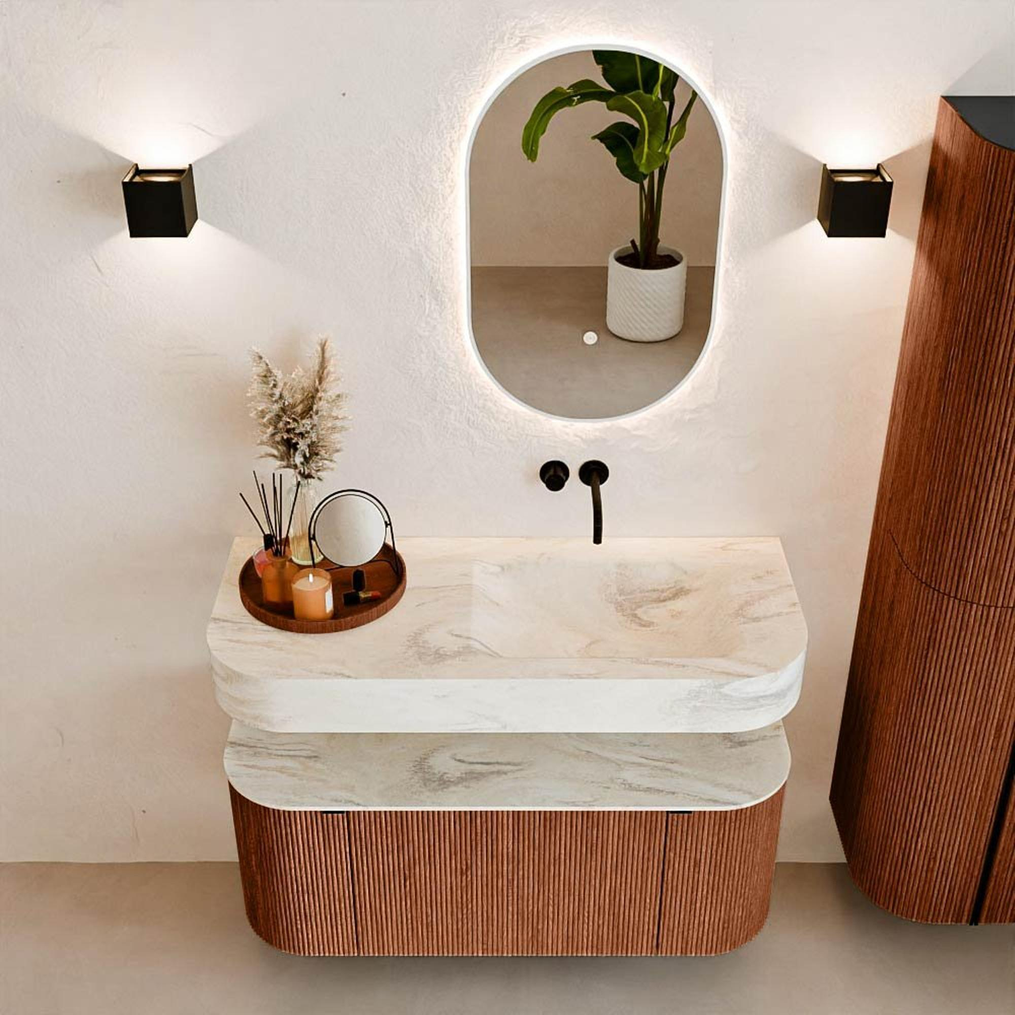 Au-dessus du meuble flotte une vasque suspendue assortie aux coins arrondis – parfaitement adaptée à la forme du meuble. La vasque est en Solid Surface et suit subtilement les lignes du meuble inférieur, créant une harmonie parfaite. Le plan de travail en Solid Surface constitue une base solide et facile d’entretien, complétant ainsi l’ensemble.