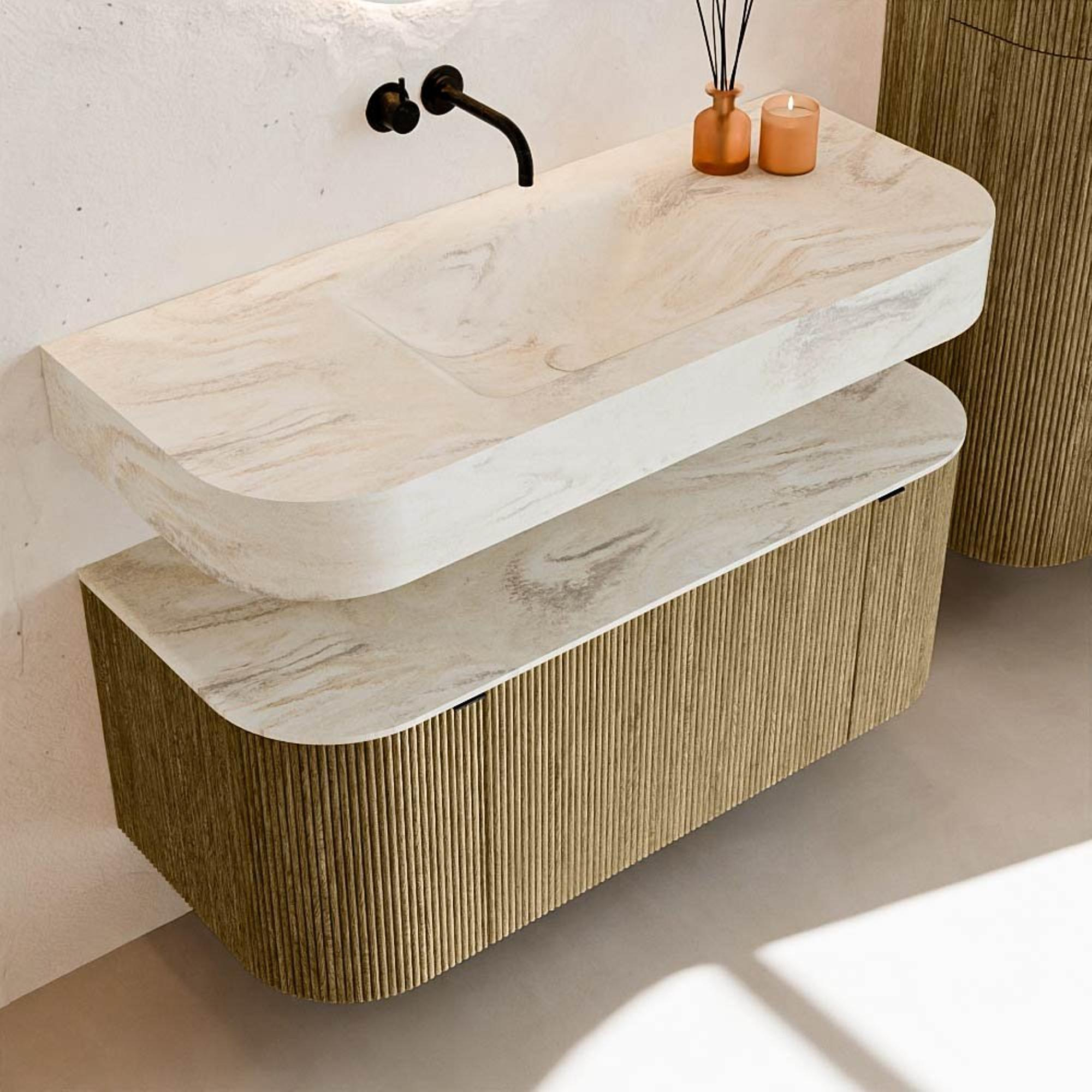 Matériaux naturels dans des tons chauds. Les nervures verticales apportent rythme et texture au design, tandis que le chêne confère une apparence chaleureuse et artisanale. Choisissez parmi 5 teintes de bois OAK, WALNUT, DUSK, SHADOW et RUBY, des couleurs de bois soigneusement sélectionnées pour enrichir les salles de bains modernes et classiques.