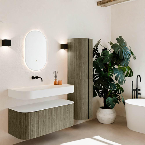 Matériaux naturels dans des tons chauds. Les nervures verticales apportent rythme et texture au design, tandis que le chêne confère une apparence chaleureuse et artisanale. Choisissez parmi 5 teintes de bois OAK, WALNUT, DUSK, SHADOW et RUBY, des couleurs de bois soigneusement sélectionnées pour enrichir les salles de bains modernes et classiques.