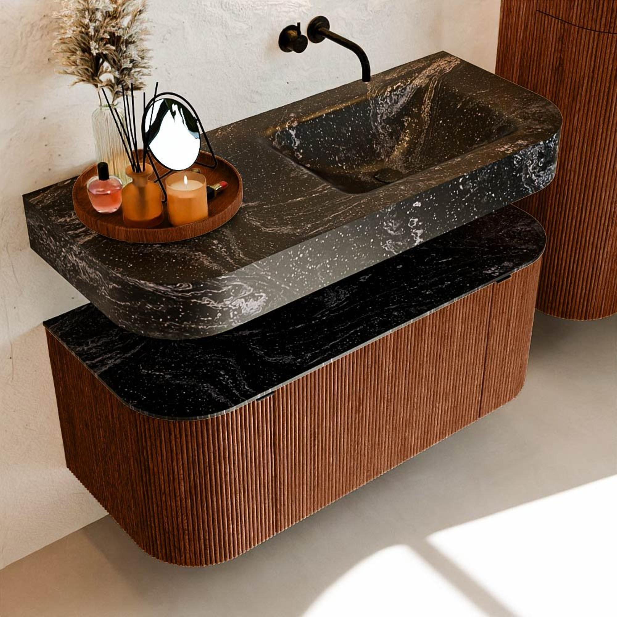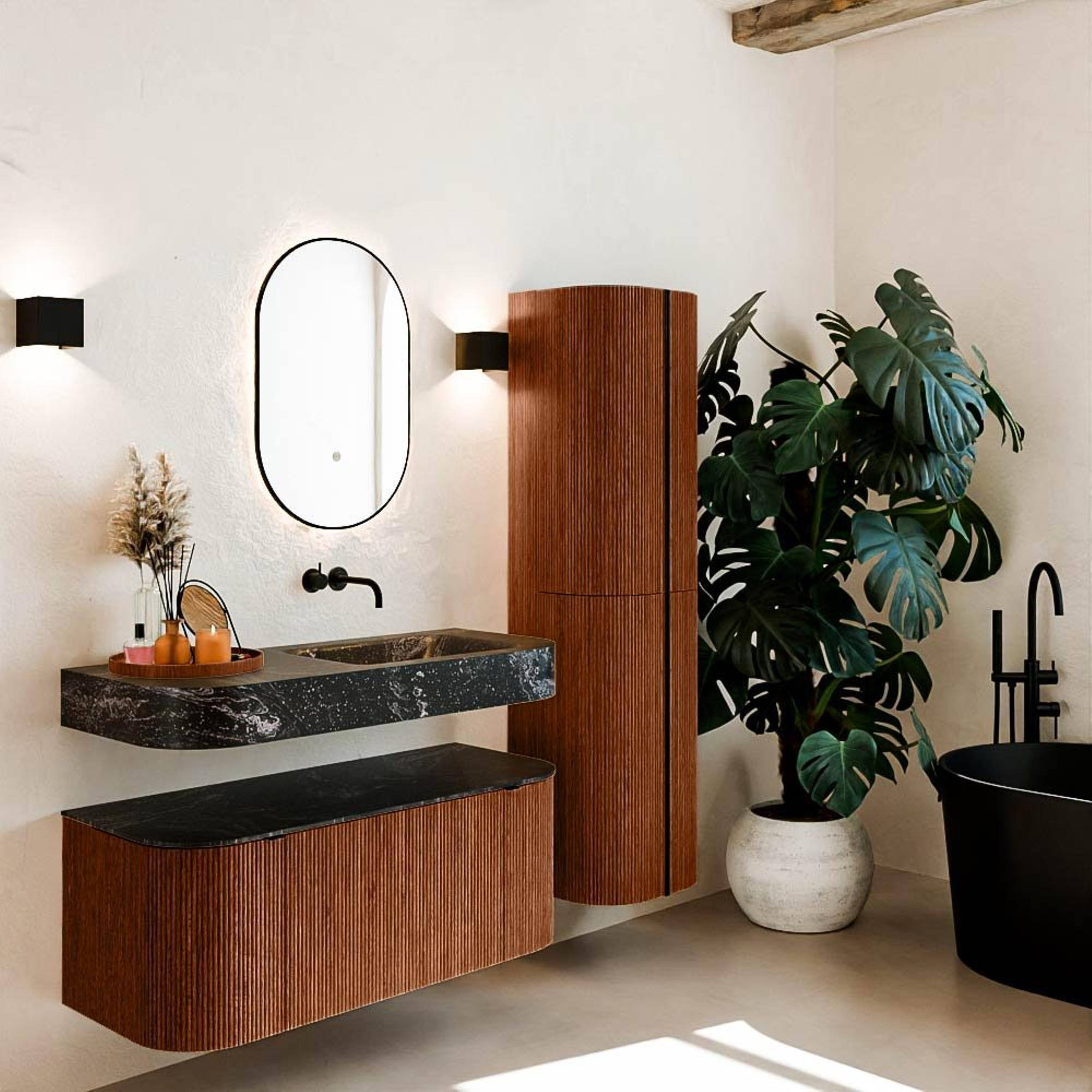 Matériaux naturels dans des tons chauds. Les nervures verticales apportent rythme et texture au design, tandis que le chêne confère une apparence chaleureuse et artisanale. Choisissez parmi 5 teintes de bois OAK, WALNUT, DUSK, SHADOW et RUBY, des couleurs de bois soigneusement sélectionnées pour enrichir les salles de bains modernes et classiques.