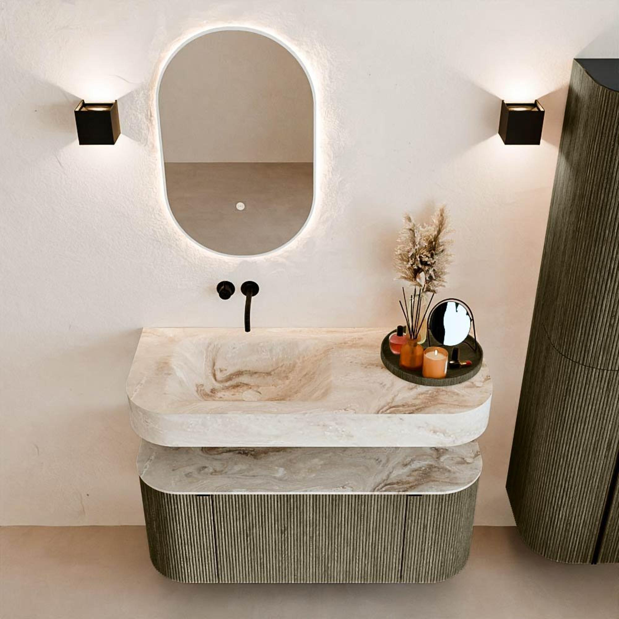 Au-dessus du meuble flotte une vasque suspendue assortie aux coins arrondis – parfaitement adaptée à la forme de l’armoire. La vasque est réalisée en Solid Surface et suit subtilement les lignes du meuble inférieur, créant ainsi un ensemble harmonieux. Le plan de travail en Solid Surface forme une base solide, facile d’entretien et complète la combinaison.